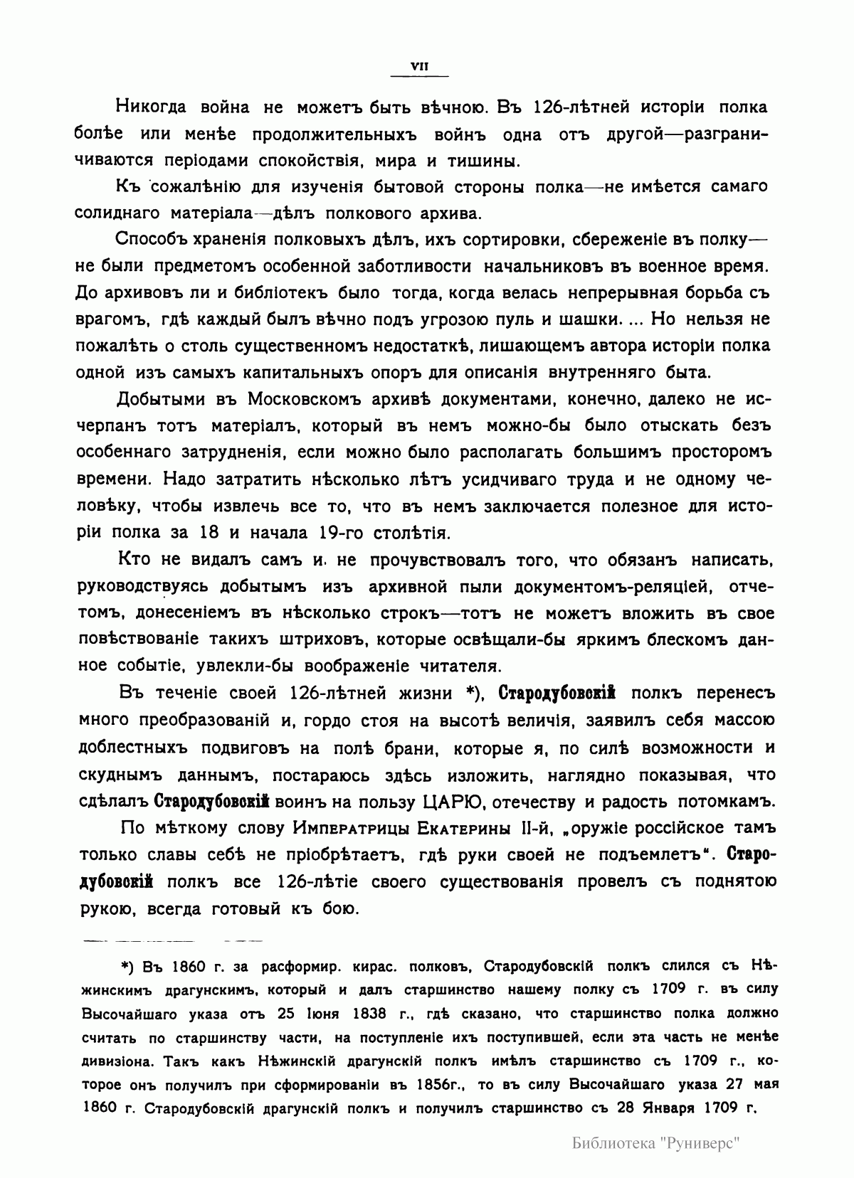 Автор, бывший офицер полка ротмистр Мартынов, в своей книге излагает историю полка с 1783 г., когда Высочайшим указом из малороссийских казаков сформирован Стародубовский конный полк в 6-эскадронном составе, по 1906 г. «В течение своей 126-летней жизни Стародубовский полк перенес много преобразований и, гордо стоя на высоте величия, заявил себя массою доблестных подвигов на поле брани, которые я, по силе возможности и скудным данным, постараюсь здесь изложить, наглядно показывая, что сделал Стародубовский воин на пользу царю, отечеству и радость потомкам».