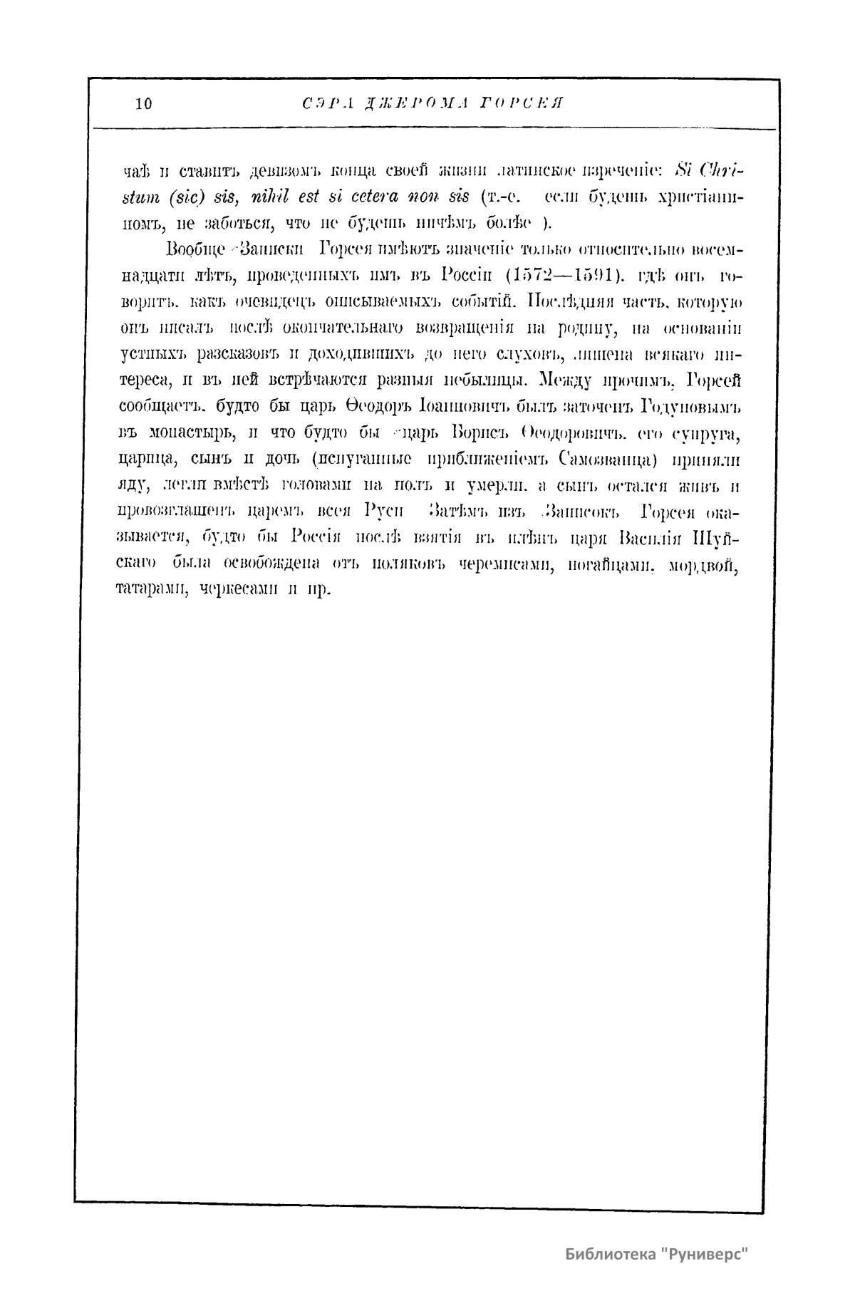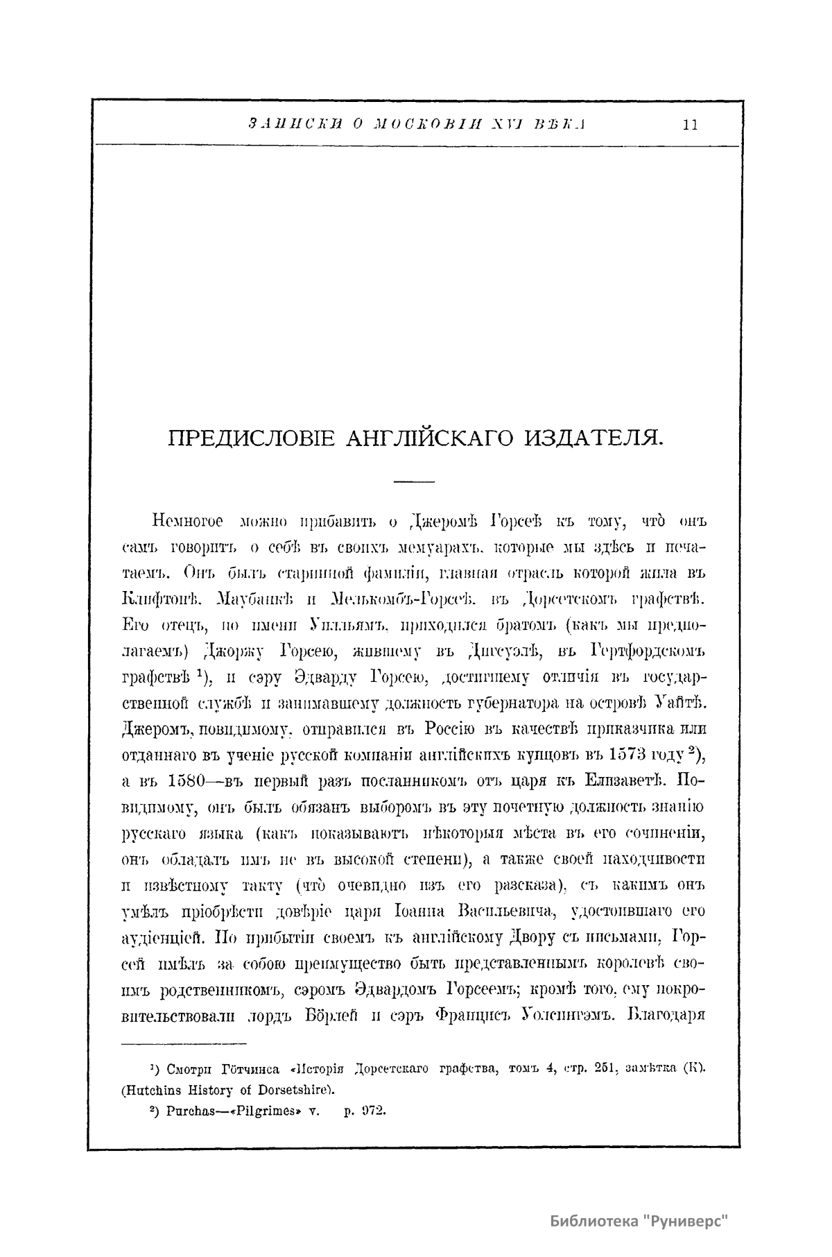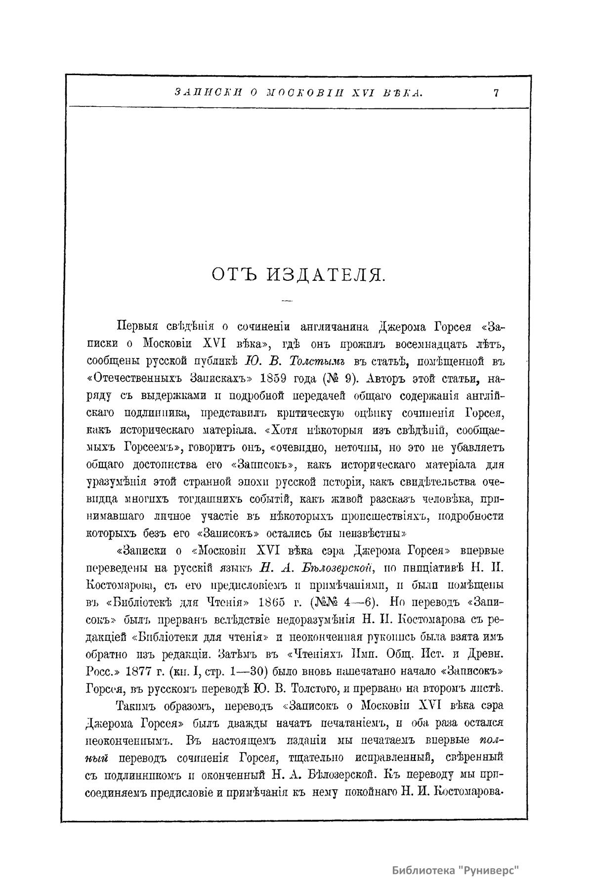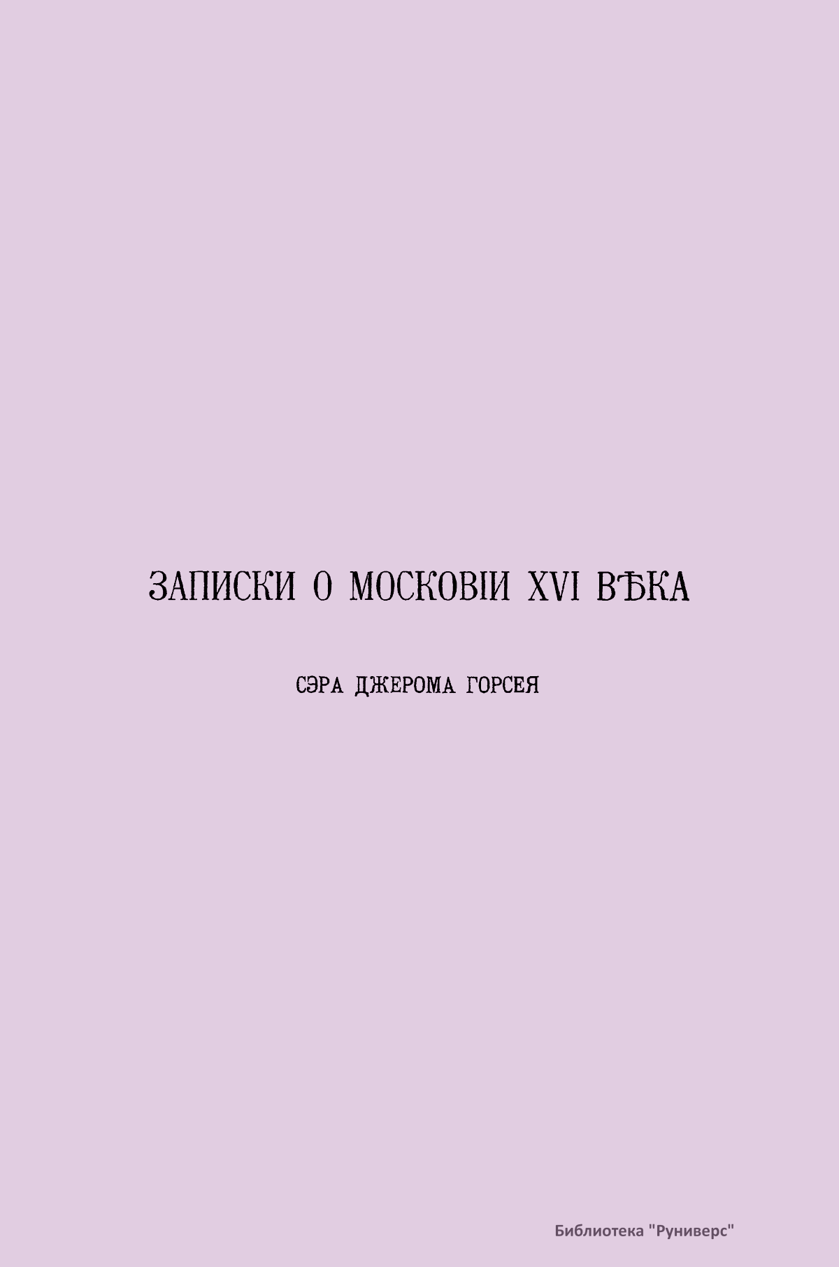 В настоящем издании впервые напечатан полный перевод сочинения Горсея с предисловием и примечаниями Н. И. Костомарова. Перевод сделан с английского подлинника «Записок» Горсея, в первый раз изданного в полном виде в 1856 г. Лондонским Гаклюйтовым обществом одной книгой с сочинением Д. Флетчера «О государстве русском», под общим заглавием «Россия в конце XVI столетия». Джером Горсей, сначала служащий и агент компании английских купцов, торгующих в России, затем посол английской королевы при русском дворе, приехал в Москву в 1572 г. и после восемнадцатилетнего почти беспрерывного пребывания в России окончательно вернулся на родину в 1591 г. «Записки» его главным образом относятся к царствованию Иоанна Грозного. Неприглядные личные свойства Горсея: чрезвычайная хвастливость, самонадеянность, корыстолюбие, угодливость, неразборчивость средств для достижения цели – не уменьшают значения его сочинения. Он подробно передает все виденное и слышанное и свои собственные наблюдения, при этом мимоходом сообщая многие любопытные черты тогдашнего русского быта. Благодаря большой памяти, он приводит целиком речи Грозного. Его суждения, в том числе и о себе самом, впечатляют своей откровенностью. «Записки» Горсея имеют значение только относительно лет, проведенных в России. Последняя часть, которую он писал после окончательного возвращения на родину на основании устных рассказов и доходивших до него слухов, лишена всякого интереса – в ней встречаются разные небылицы.