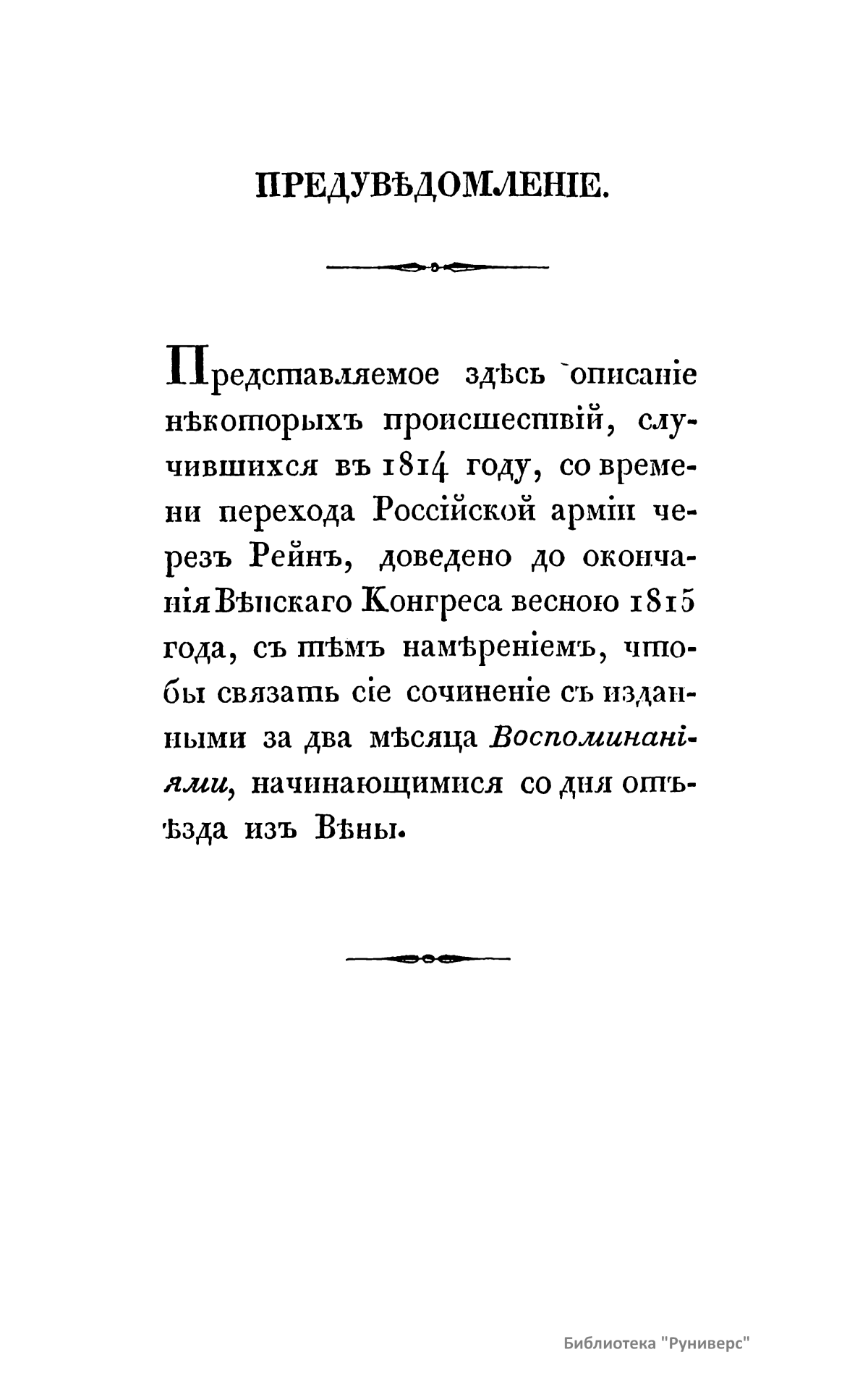В настоящем издании флигель-адъютантом Александра I описаны некоторые происшествия начиная с перехода российской армии через Рейн в 1814 г. и заканчивая Венским конгрессом весной 1815 г. Подробное оглавление находится в конце книги. Эта публикация связана с другим сочинением того же автора «