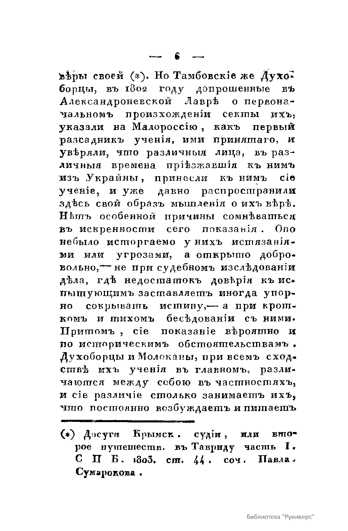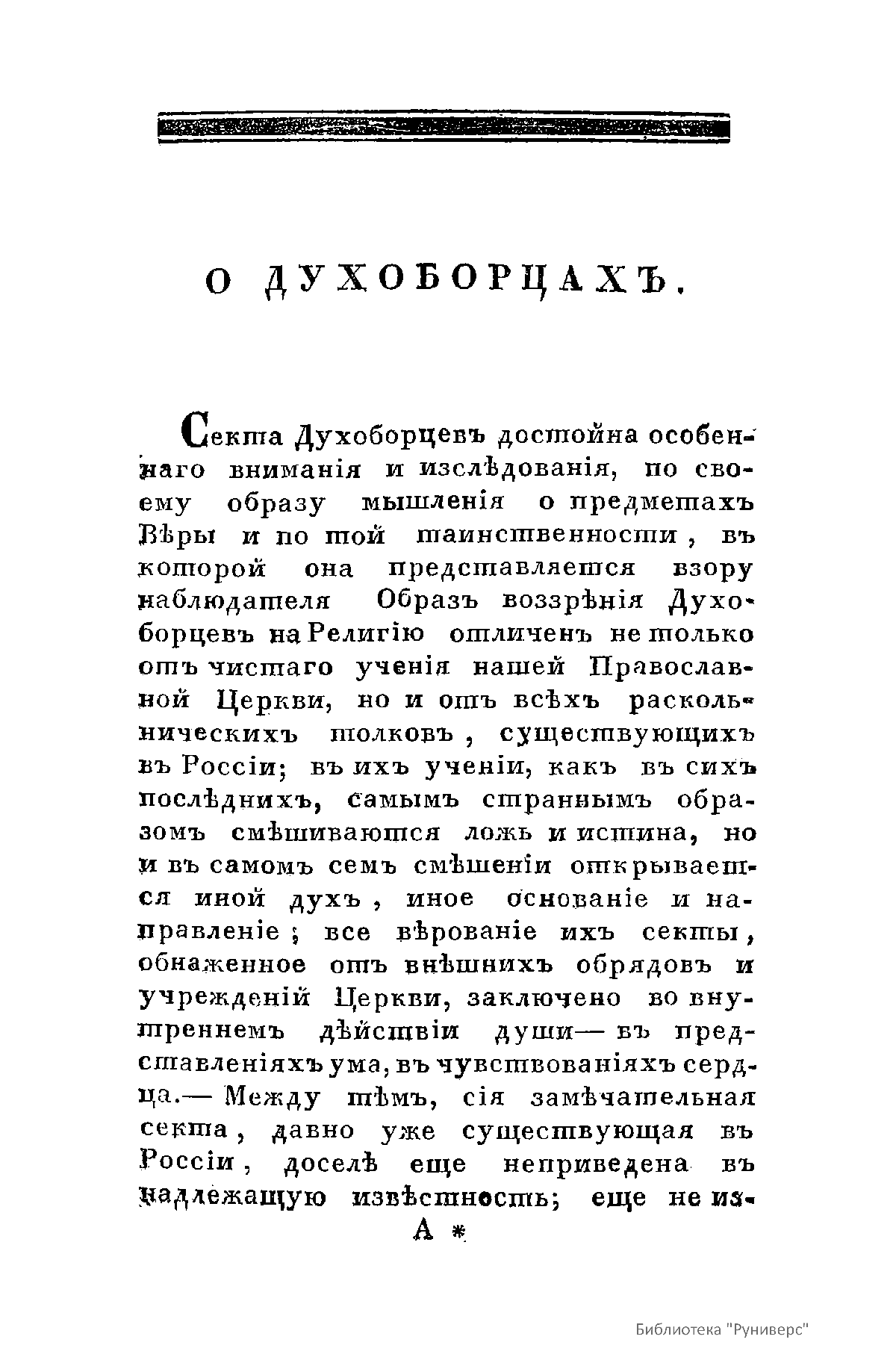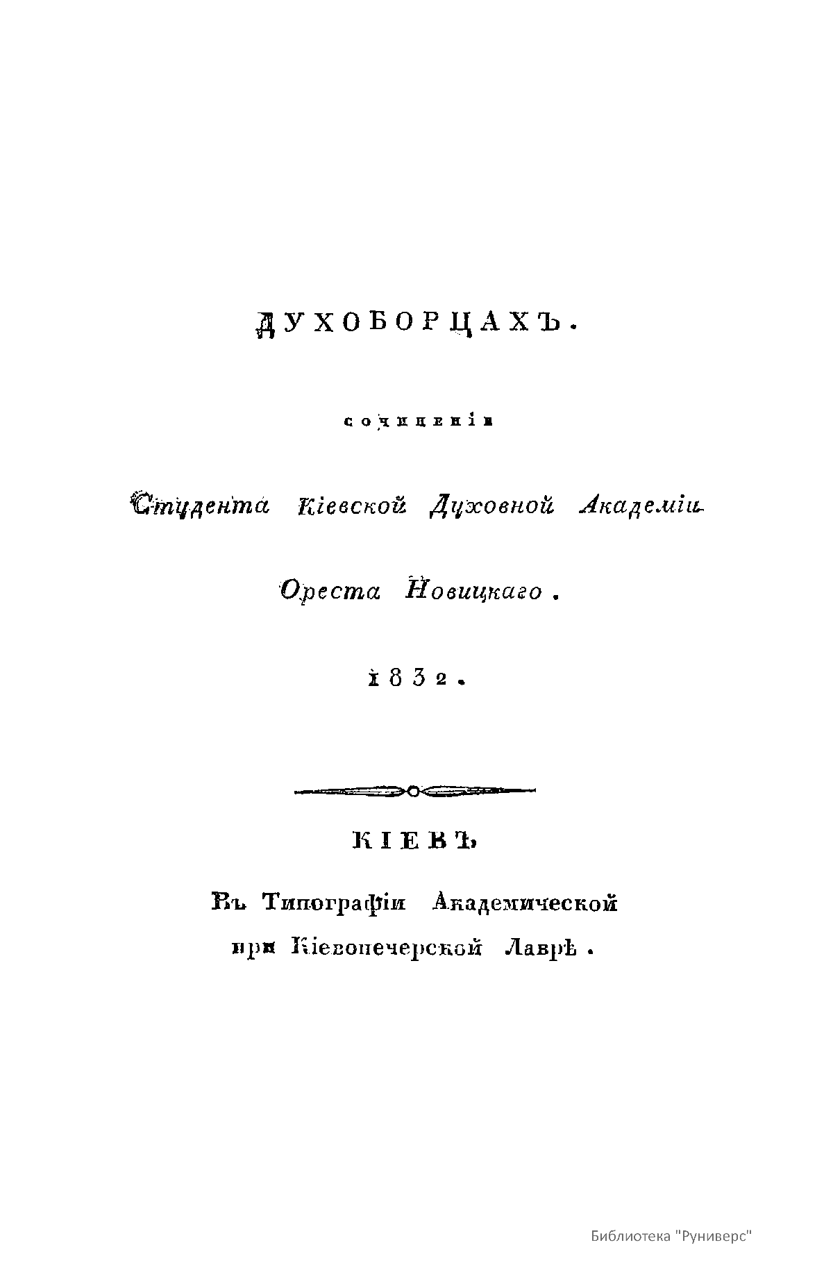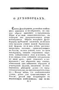 По самому составу своему из двух слов ("дух и борец", соответствуя образованию слова иконо-борец), это направление религиозной мысли означает тех, которые отвергают духа, вступают в борьбу против всего духовного: и духоборцы, отвергая все таинства церкви, по этому уже самому восстают против действующего в ней духа. Но отрицая всю религиозную внешность, они считают себя борцами за духа. Первоначально они называли себя сынами божиими в том предположении, что в них Божество выражается с большею полнотою, чем во всех других людях. Простой народ иногда называл их фармазонами (т. е. франк-масонами), слово, которым он отличает, людей, своевольно нарушающих постановления церкви. Итак, возникнув в лоне православной церкви, она уклонилась от нее дальше всех. При этом долгое время никто вполне не исследовал исторических ее обстоятельств, не раскрыл ее учения, не обозначил ее характера: так что о ней знали или по одному имени, или по частным рассказам. Чтобы пополнить этот пробел в истории религиозных разномыслий, автор постарался изложить как внешнюю, так и внутреннюю историю духоборчества, на сколько это возможно было для него при тех источниках и документах, какие он имел под рукой. В