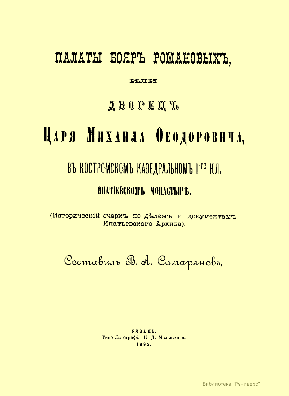 Палаты бояръ Романовыхъ, или дворецъ Царя Михаила ѳеодоровича, въ костромскомъ каѳедральномъ 1-го кл. Ипатiевскомъ монастырѣ
