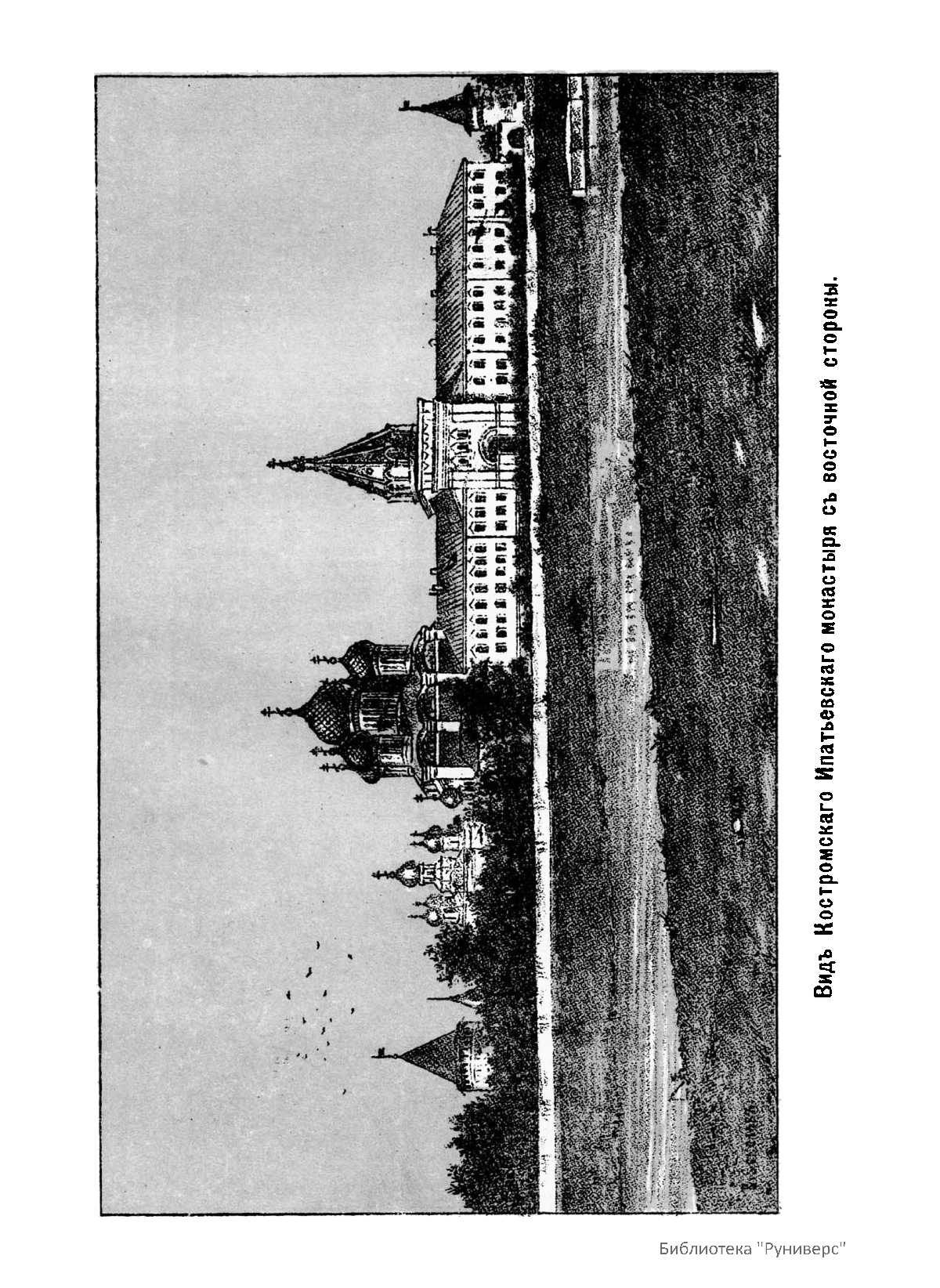 Исторический очерк по делам и документам Ипатьевского архива. В издании представлены: краткий исторический очерк костромского Ипатьевского монастыря (10); сообщение о месте, занимаемом палатами Романовых в монастыре, когда и кем они построены, кто занимал это здание до и после 1613 г. (19); сообщение о состоянии наместнических келий в XVII и XVIII вв. (28); о наместнических кельях в начале XIX в., которые принимают название царских чертогов и дворца царя и великого князя Михаила Федоровича, и о ряде мер со стороны епархиального начальства к охранению чертогов от разрушения (41); о следах особого внимания членов царствующего Дома к келиям Михаила Федоровича в Ипатьевском монастыре по делам и документам с XVII по XIX в. (67); о посещении Ипатьевского монастыря и палат Михаила Федоровича Высочайшими особами царствующего в России Дома. К изданию прилагаются: вид костромского Ипатьевского монастыря с восточной стороны (8); портрет Михаила Федоровича (26); портрет патриарха Филарета Никитича (80); портрет великой старицы инокини Марфы Иоанновны (82); изображение памятника костромскому крестьянину Ивану Сусанину, «за царя, спасителя веры и царство живот свой положившему» (66); план Ипатьевского монастыря 1794 – 1799 гг. и его экспликация (93); смета майора и архитектора Мичурина на исправление ветхостей в кельях наместнических 1742 г.; вид палат царя Михаила Федоровича в 1832 г. (100); различные планы палат; опись древностей Ипатьевского монастыря (104).