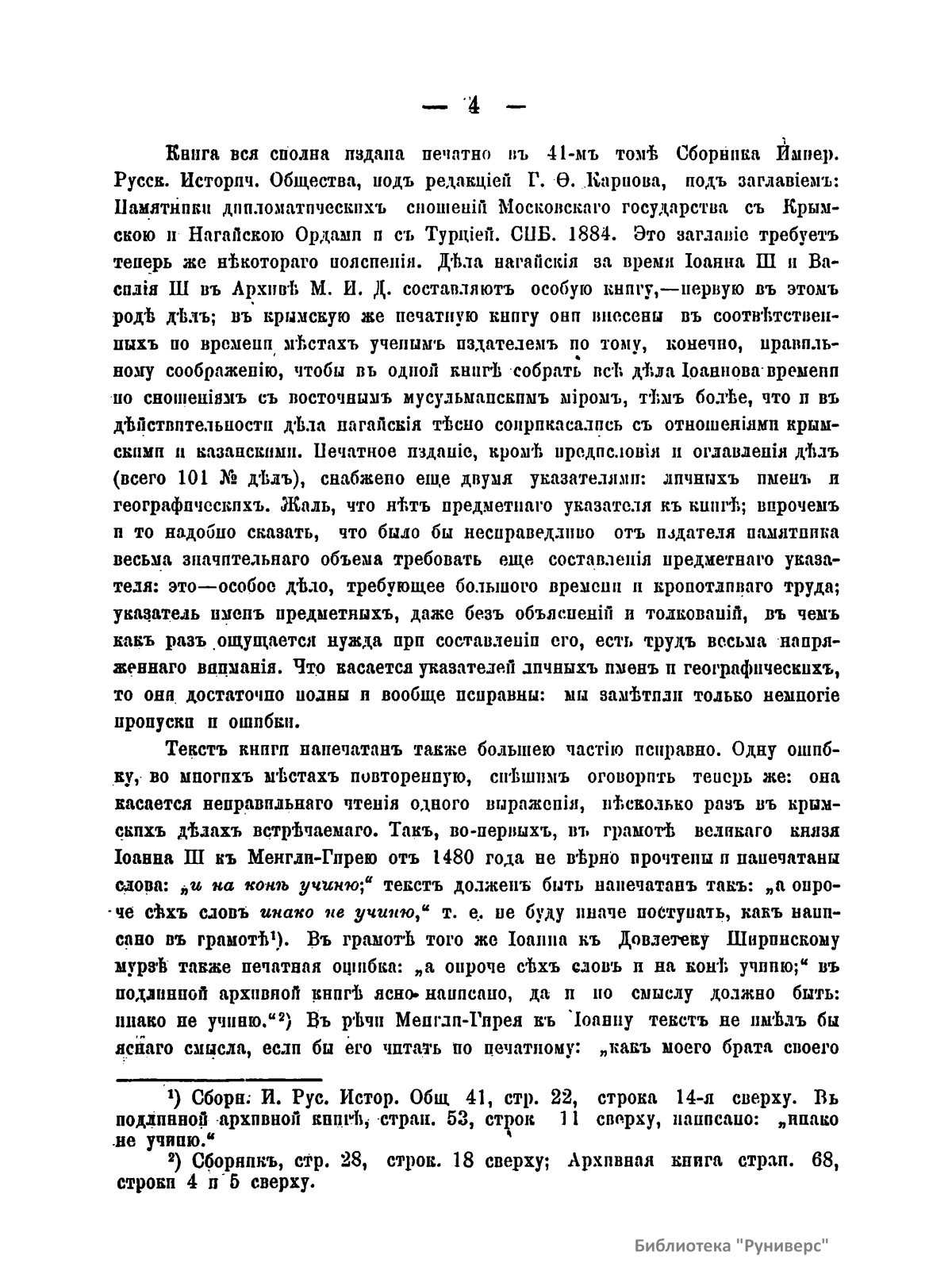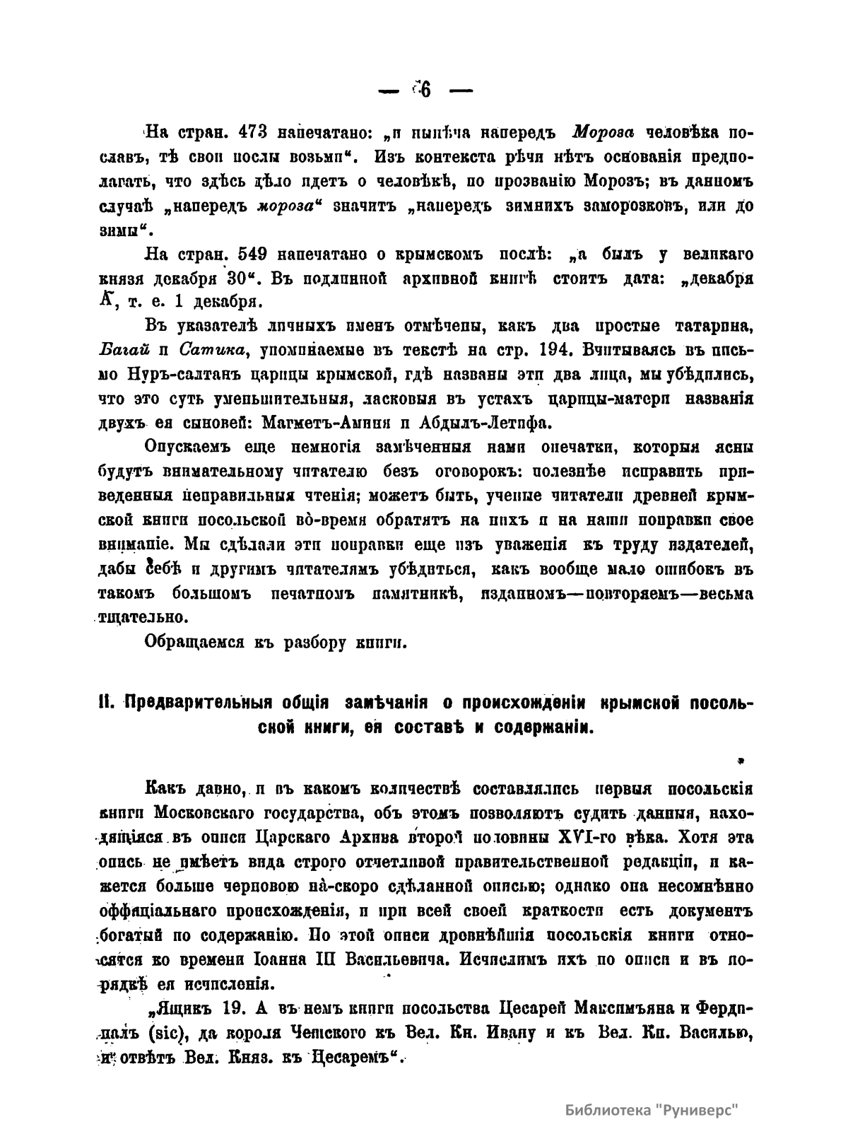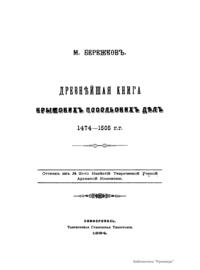 Настоящая брошюра посвящена характеристике самой древней посольской книге крымских дел, хранившейся в Главном архиве министерства иностранных дел в Москве. Эта книга представляет собой цельную летопись посольских сношений Ивана III Васильевича с его союзником – крымским царем Менгли-Гиреем. В нее внесены и дела по сношениям с турецкой Кафой и Царьградом, Казанью, Молдавией, Угрией, Польско-Литовским государством, так как дела этих земель соприкасались между собой для Московского государства и Крыма. В книге содержится много данных о внутренней жизни Московского государства и Крымской орды, а также всего татарско-турецкого мусульманского мира. Изложение книги ясное и стройное, язык образцовый по чистоте и правильности. Она «есть мастерское в своем роде произведение приказных посольских дьяков великого князя Ивана III; под их пером политическая мысль Ивана Великого получила искусное выражение, а все посольские дела – ясное отчетливое изложение». Автор рассматривает следующие вопросы: внешность книги и ее внешняя судьба (2); предварительные общие замечания о происхождении крымской посольской книги, ее составе и содержании (6); из каких именно документов составлена посольская книга (14).