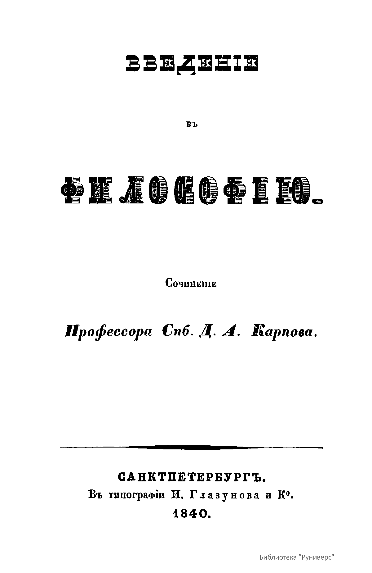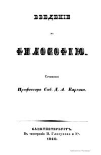 «Предлагаемое теперь читателям «Введение в философию» заключает в себе мои мысли вообше о философии и об образе систематического ее развития», — писал автор в предисловии к своему сочинению. «Старость не за горами, жизнь коротка и конец ее неизвестен: пора, кажется, позаботиться и об отчете, и оправдаться даже пред теми людьми, которые судят о науке и ученых только по печатным документам», — так обращался В.Н. Карпов к своим читателям. На страницах ряда журналов появились отзывы, авторы которых рекомендовали читателям ознакомиться с этим философским трактатом. «Введение в философию» г. Карпова представляет утешительное явление по тому уже одному, что автор, как видно из целой книги, занимается своим предметом с уважением, что для него философия не игрушка, как у большей части наших доморощенных философов, и что он не шутя старается определить, в чем она заключается», — отмечал Виссарион Белинский, опубликовавший в «Отечественных записках»