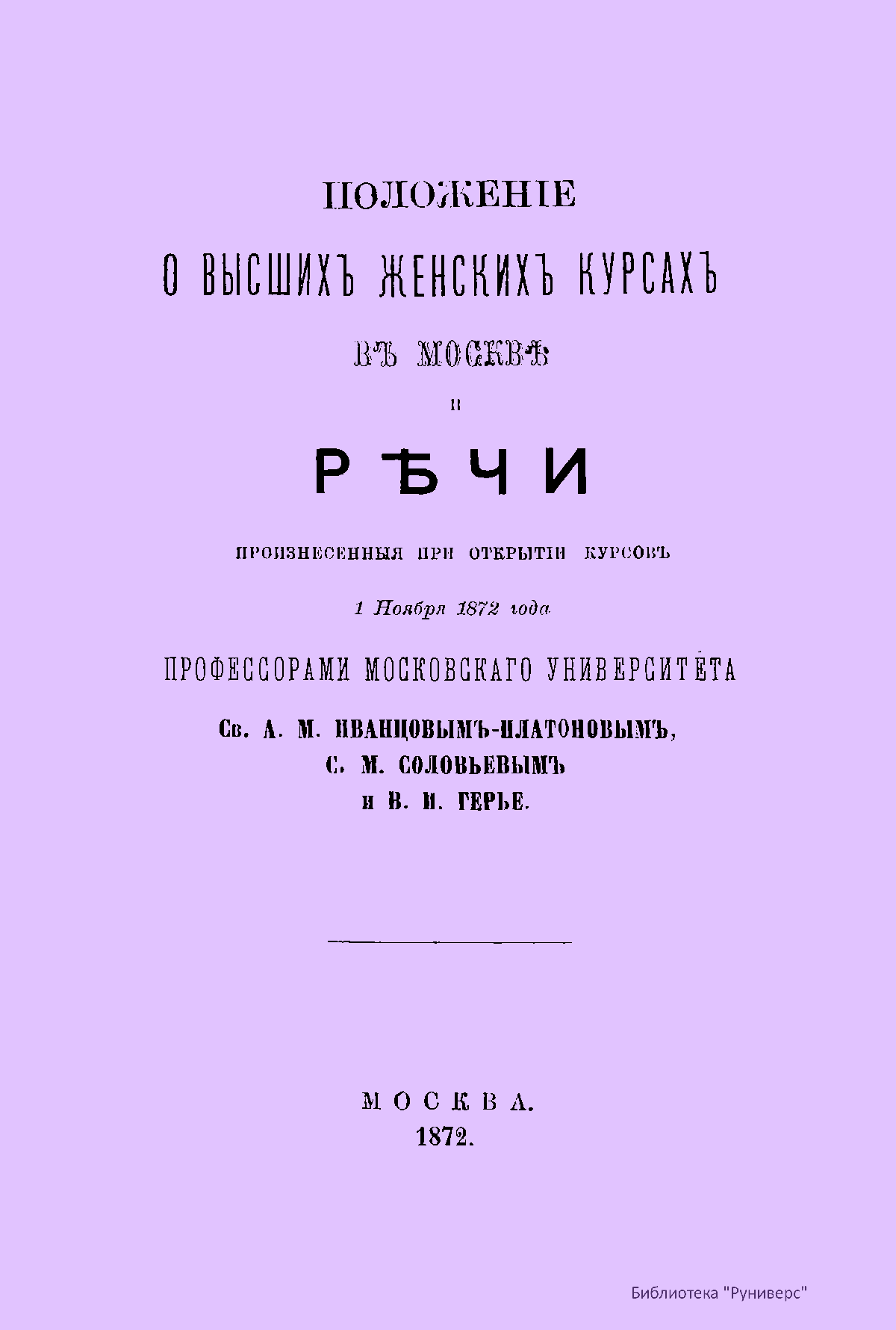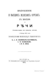 Положенiе о высшихъ женскихъ курсахъ въ Москвѣ и рѣчи произнесенныя при открытiи курсовъ 1 ноября 1872 года профессорами московскаго университета Св. А.М. Иванцовымъ-Платоновымъ, С.М. Соловьевымъ и В.И. Герье