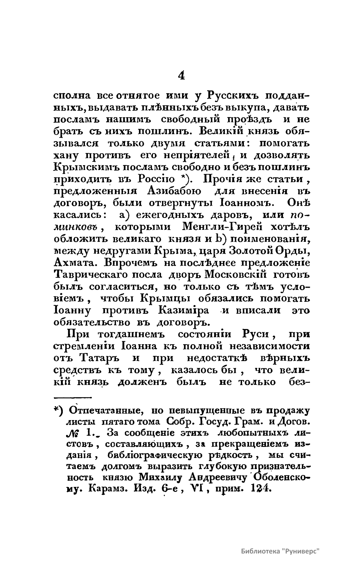 В брошюре опубликованы материалы из четырех номеров «Московских ведомостей» за 1855 г., посвященные крымской политике Ивана III. Иван III поддерживал крымского хана Менгли-Гирея, обеспечивая себе союзника против Литвы и Заволжского хана. Менгли-Гирей, в свою очередь, укреплял свое положение на Крымском юрте. По договору 1473 г. между Россией и Крымом, крымский хан обязывался «быть с великим князем в братской дружбе, любви и вечном мире, стоять с ним заодно на всех его недругов, не воевать владений Московского княжества, казнить разбойников и возвращать все отнятое ими у русских подданных, выдавать пленных без выкупа, давать послам свободный проезд и не брать с них пошлин». Великий князь обязывался только двумя статьями: помогать хану против его неприятелей и дозволять крымским послам свободно и без пошлин приходить в Россию. Отношения с Крымом росли и развивались с каждым годом до смерти Ивана III в 1505 г., прервавшей его намерение возвратить при помощи Крыма все отторгнутые некогда Литвой русские области за Днепром.