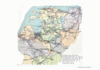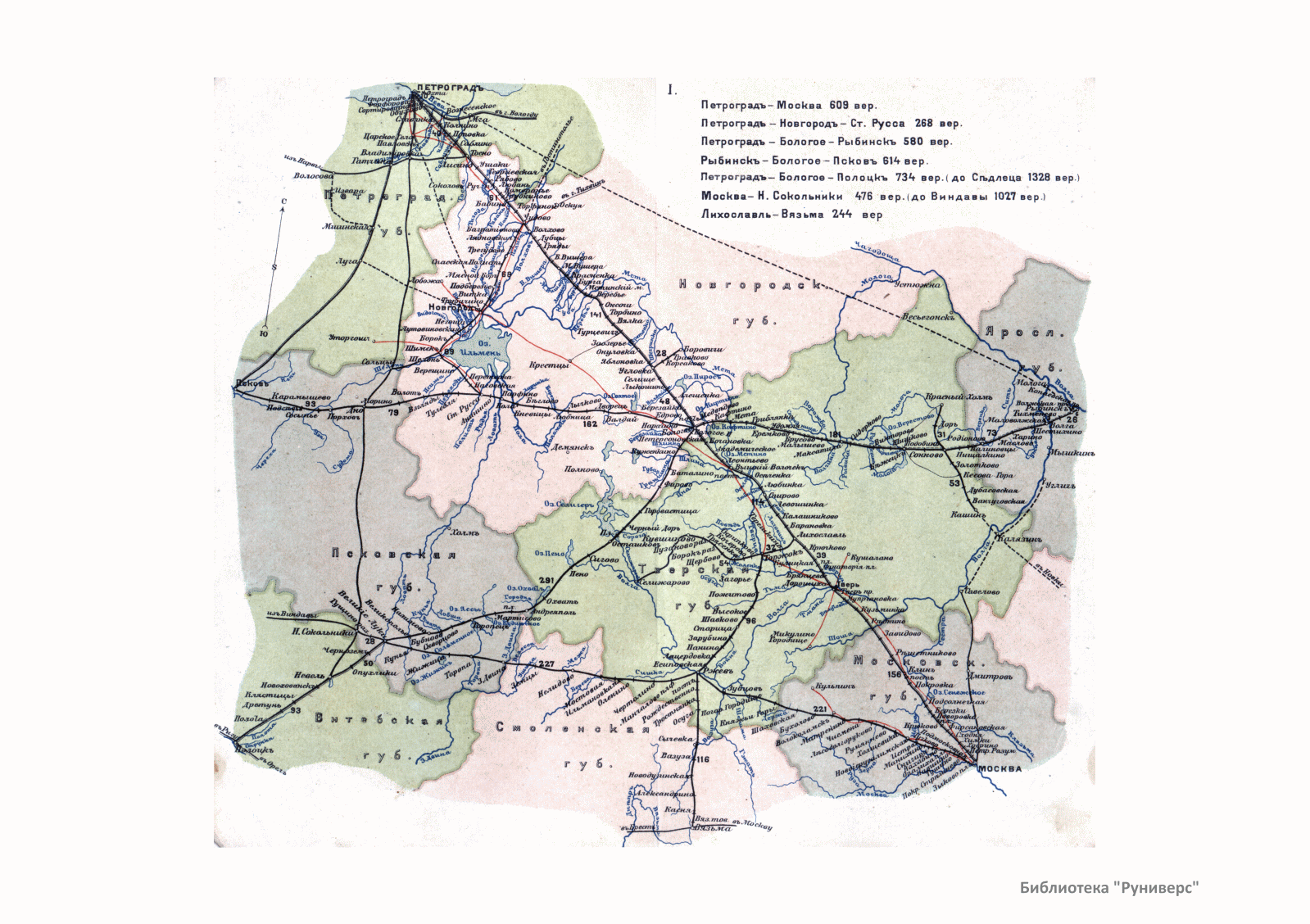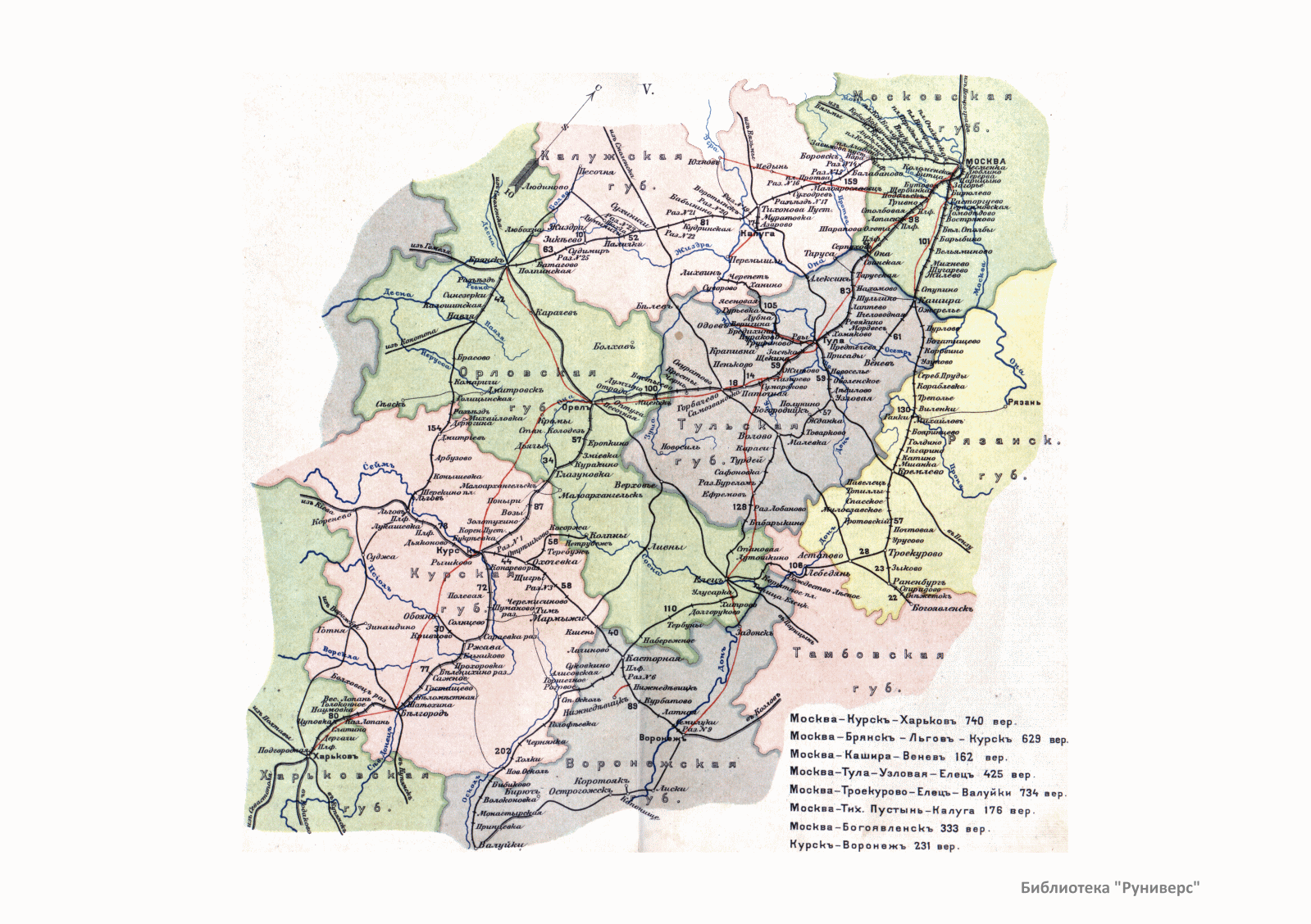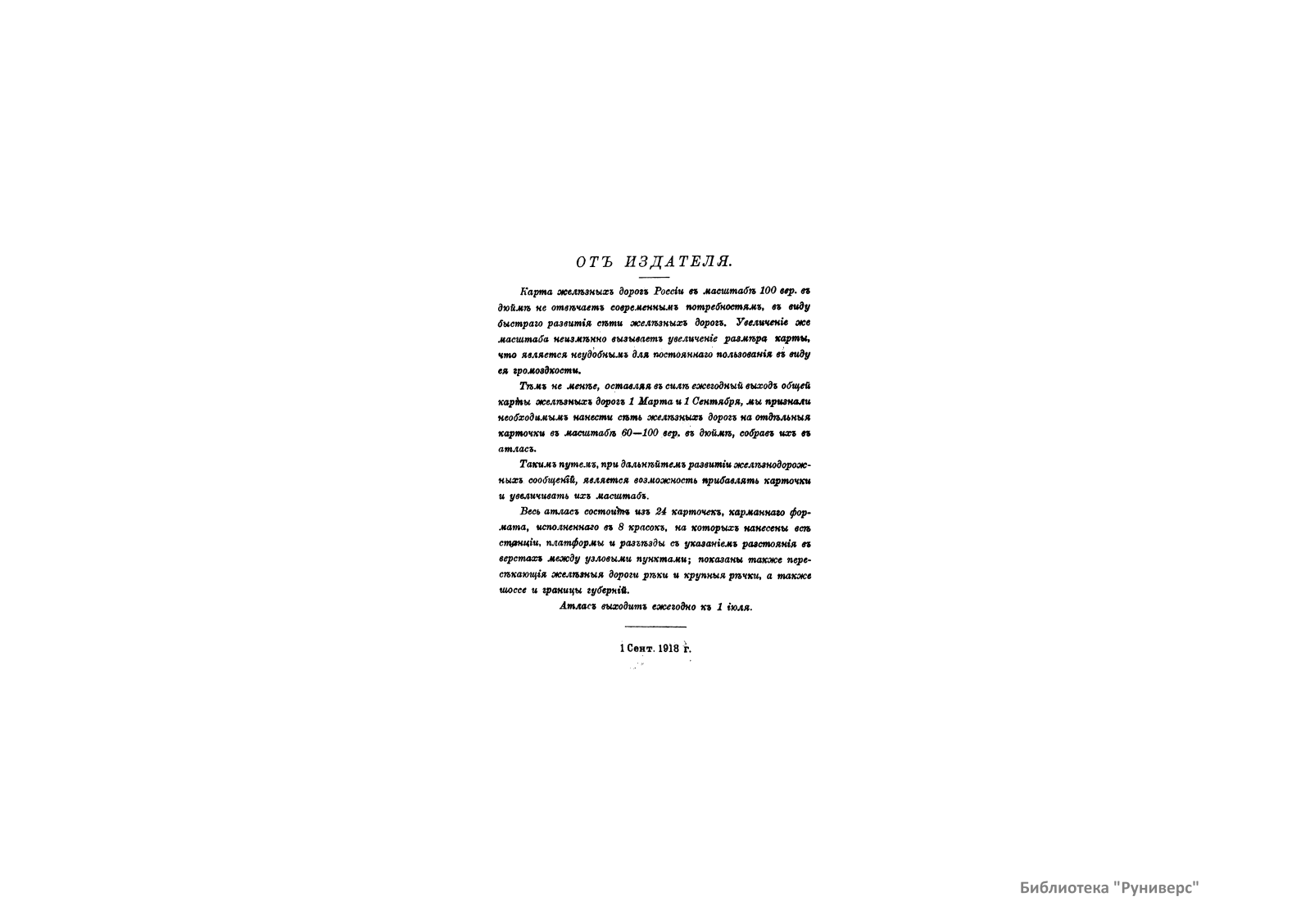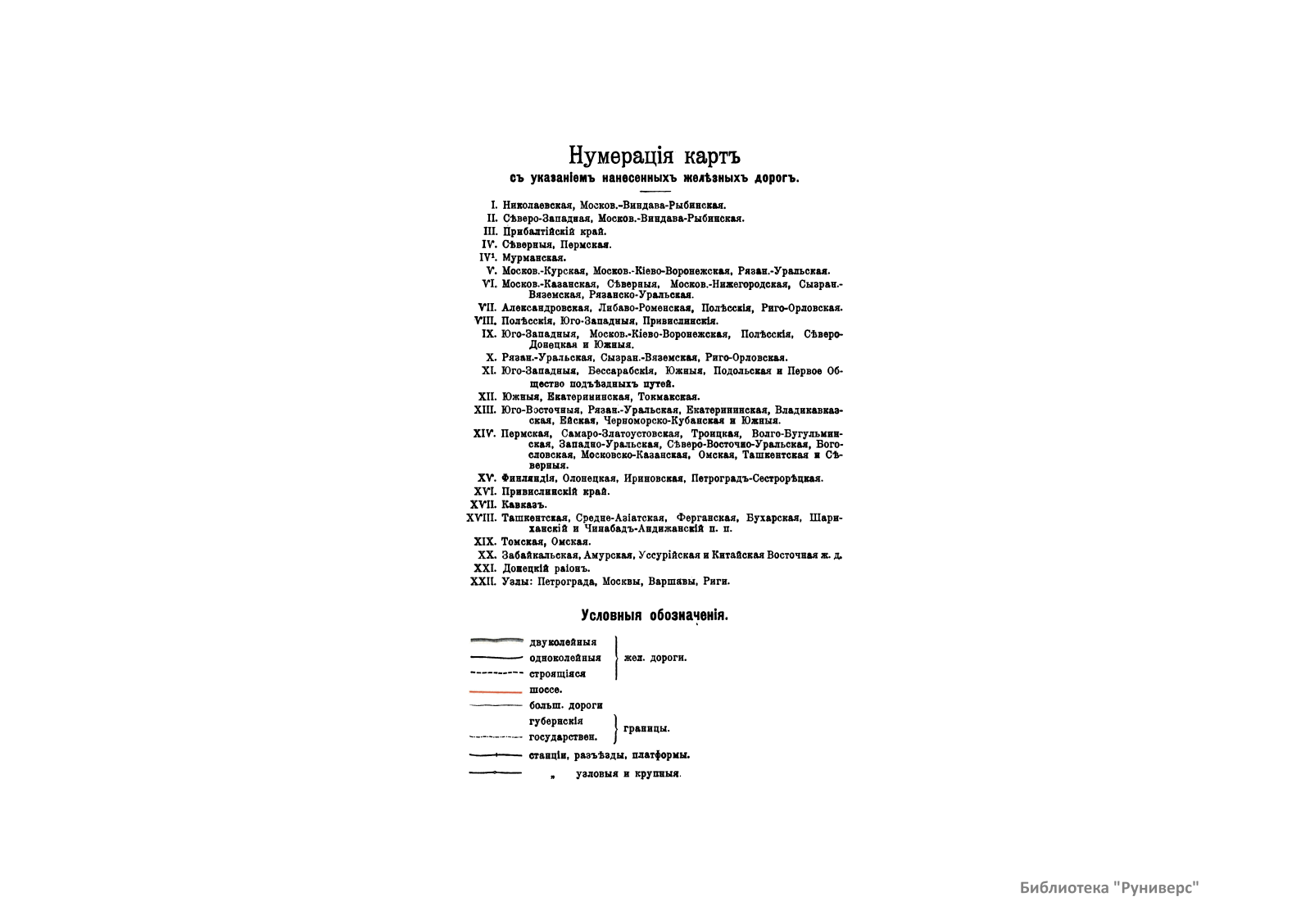 Атлас состоит из 22 карточек карманного формата, на которых нанесены все станции, платформы и разъезды с указанием расстояния в верстах между узловыми пунктами. Показаны пересекающие железные дороги реки, а также шоссе и границы губерний.