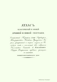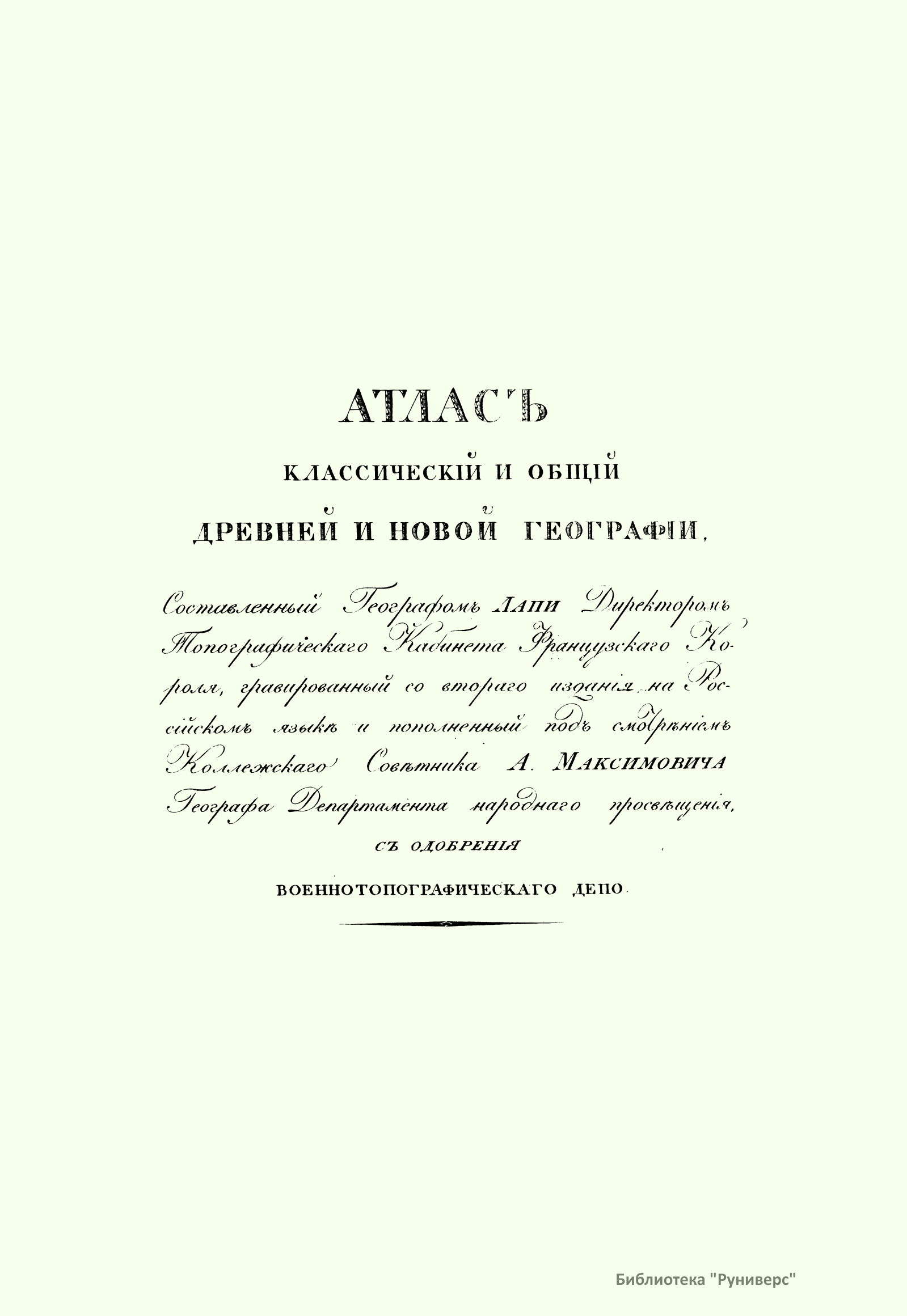 Атлас «классической и общей Древней и Новой Географии, составленный Географом Лапи, Директором Топографического Кабинета Французского Короля, гравированный со второго издания на Российском языке и пополненный под смотрением Коллежского Советника А. Максимовича, Географа Департамента народного Просвещения, с одобрения Военнотопографического депо». Атлас вышел в свет в Санкт-Петербурге в 1821 г. Данный атлас состоит из 35 иллюминованных гравированных листов, из которых 6 последних (№ 30 — 35) посвящены истории Древнего мира.