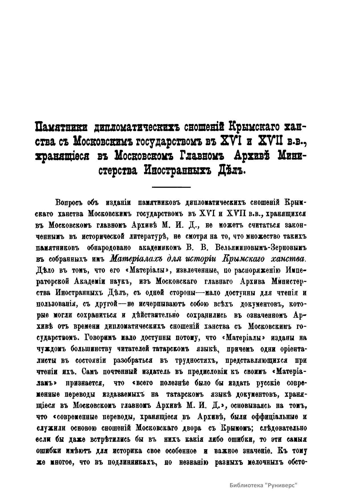 В настоящем издании опубликованы памятники дипломатических сношений Крымского ханства с Московским государством в XVI и XVII вв., хранившиеся в Московском главном архиве министерства иностранных дел. Большинство документов составляют шертные, или договорные, грамоты крымских ханов и записи их послов. Отношения между Крымским ханством и Московским государством не были мирные. Эти отношения и определяют характер договоров. С одной стороны, Московское государство старается задобрить хана и отправляет к нему посла, который, пользуясь неблагоприятными для Крыма обстоятельствами, а большей частью путем задаривания хана и его приближенных, получает от него шертную грамоту. В ней хан обязывается за себя и «за весь крымский юрт» «быть в союзе, любви и дружбе», «быть заодно против недругов московского государя», «не воевать русских украинных городов», «давать свободный проезд купцам» и т.д. С другой стороны, Крым дает шерт только на время, чтобы усыпить внимание врага или выждать более благоприятное время для враждебных действий, за которыми должен наступить новый договор и новые подарки. Таким образом главным предметом переговоров враждующих соседей была торговля, благодаря которой памятники дипломатических сношений Крыма с Москвой приобретают своеобразный характер, отличающий их от дипломатических документов других государств.