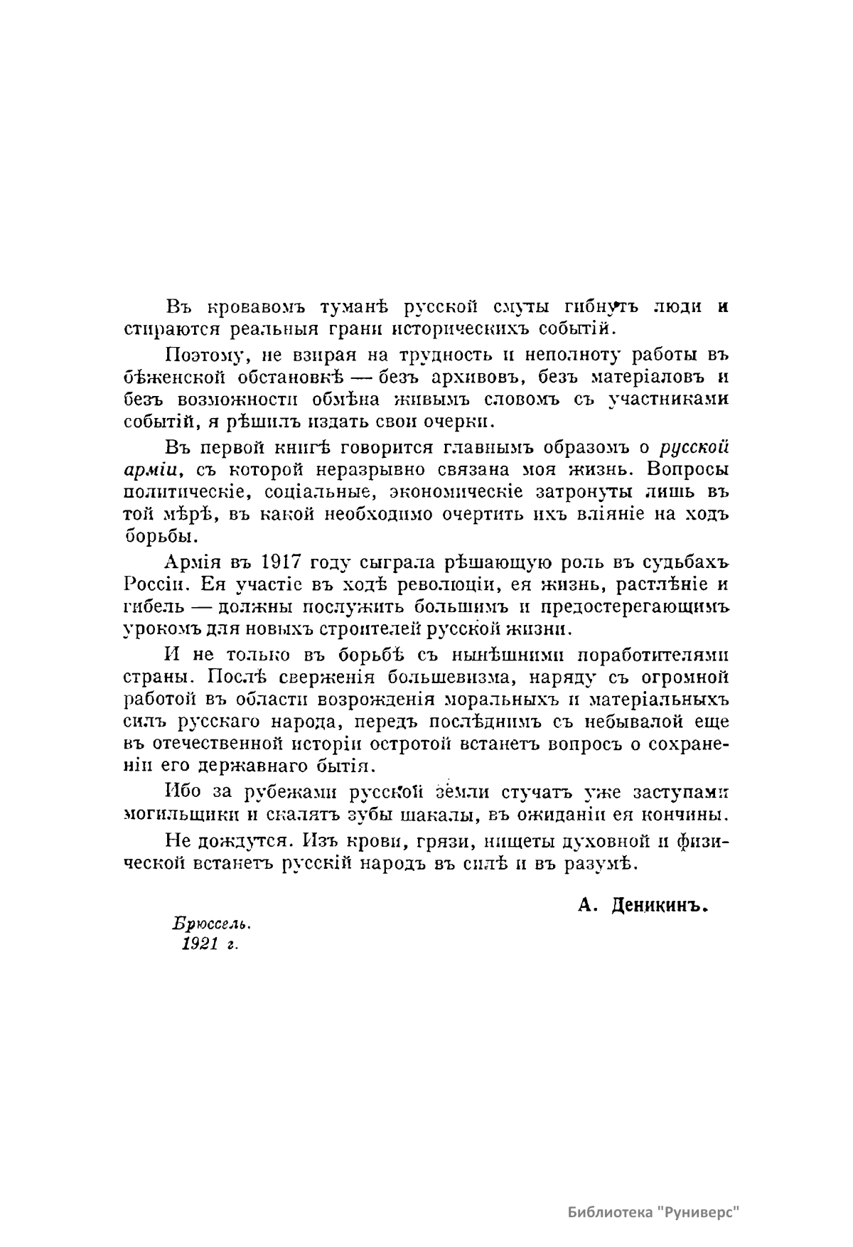 Очерки генерала Деникина, написанные им в изгнании в 1921 г. о революционной России. В первой книге говорится главным образом о русской армии, которая в 1917 г. сыграла решающую роль в судьбах России. Вопросы политические, социальные и экономические затронуты лишь в той мере, в которой необходимо очертить их влияние на ход борьбы. Вторая книга посвящена генералу Корнилову, начавшему борьбу против стихийного безумия, охватившего страну. В ней автор обращается к тем, «кто и при жизни Корнилова, и после его смерти отдавали ему цветы своей души и сердца, кто некогда доверил ему свою судьбу и жизнь». Третья книга посвящена белому движению и борьбе добровольческой армии. Четвертая – вооруженным силам юга России.