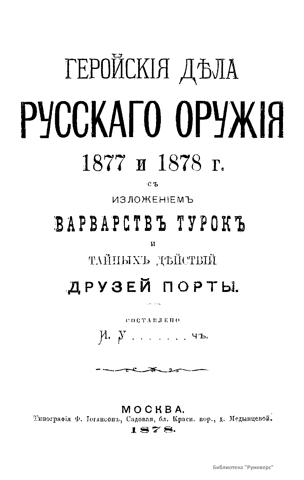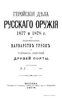 Геройскiя дѣла русскаго оружiя 1877 и 1878 г. съ изложенiемъ варварствъ турокъ и тайныхъ дѣйствiй друзей Порты