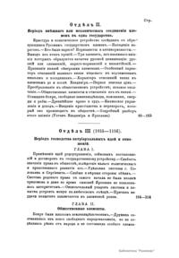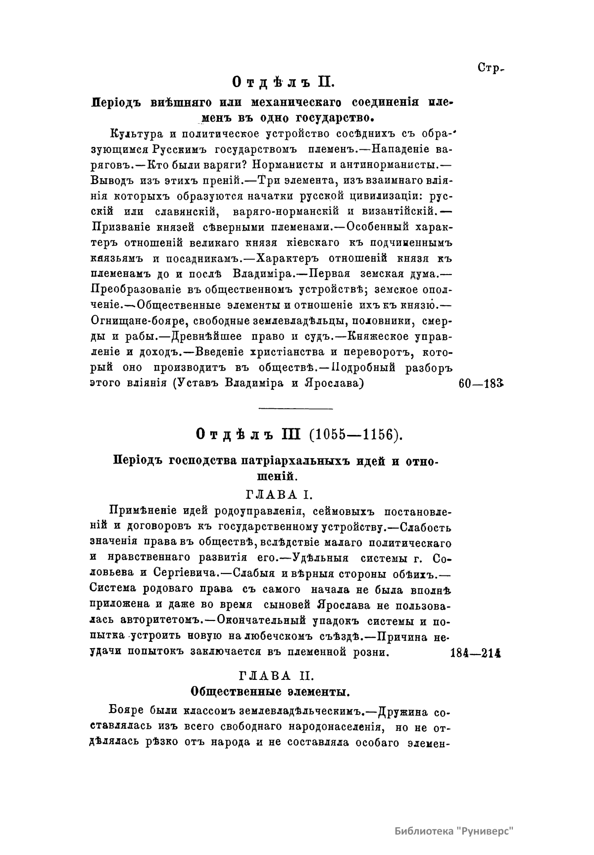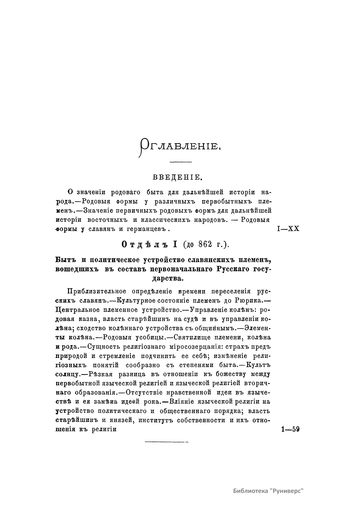 В книге рассматриваются следующие положения: Быт и политическое устройство славянских племен, вошедших в состав первоначального русского государства (до 862 г.). Период внешнего или механического соединения племен в одно государство. Период господства патриархальных идей и отношений (1055 – 1156). Общественные элементы. Государственное устройство и управление. Право, суд и законодательство. Церковь и ее отношение к обществу и государству. Умственное движение. Идеи и люди этого времени. Период политической дезорганизации и нравственного упадка общества (1155 – 1237). Особенности Новгородской истории и политические учреждения Новгорода (862 – 1237).