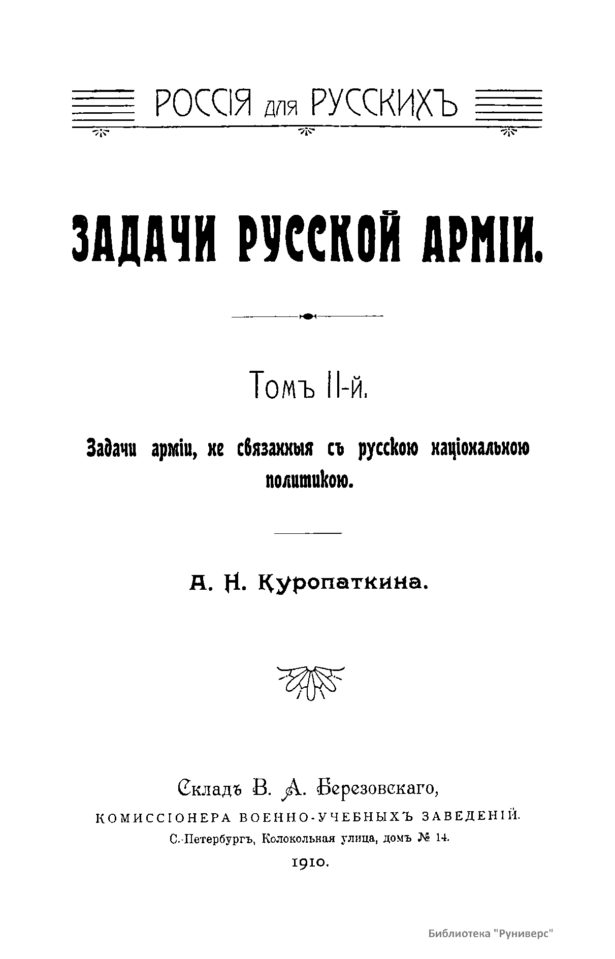 Задачи русской армiи. Томъ II-й. Задачи армiи, не связанныя съ русскою нацiональною политикою
