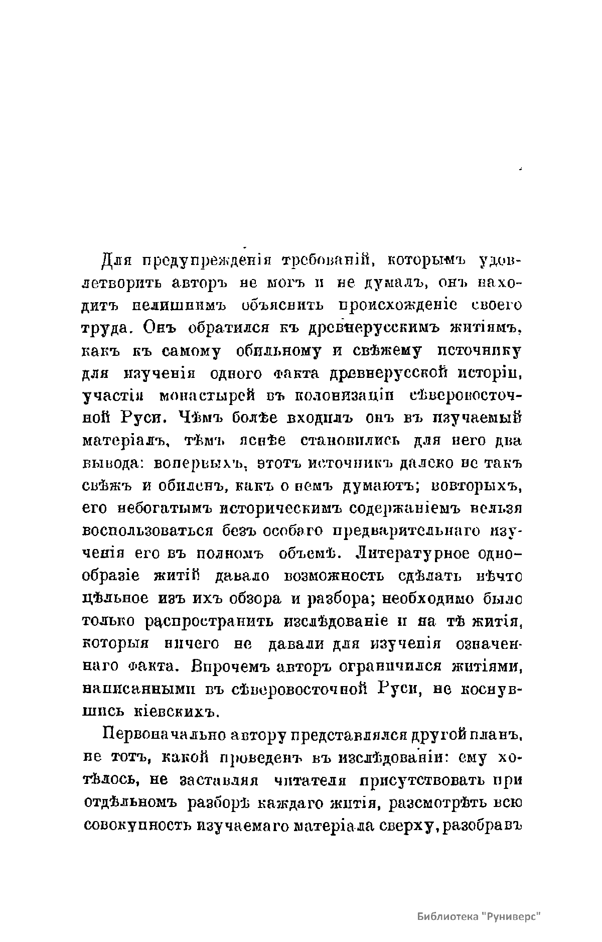 Автор обращается к древнерусским житиям святых для изучения одного факта русской истории – участия монастырей в колонизации северо-восточной Руси. Он приходит к выводу о том, что небогатым историческим содержанием житий нельзя воспользоваться без особого предварительного изучения его в полном объеме. Качество исторического материала, предоставляемого житием, зависело главным образом от обстоятельств при которых писалось последнее, и от литературных целей, которые ставил его автор. Эти обстоятельства и цели, время появления жития, личность биографа, его отношение к святому, источники, которыми он располагал, частные поводы, вызвавшие его труд, и литературные приемы, которыми он руководствовался, - вот главные вопросы, которые задавал себе исследователь при разборе каждого жития.