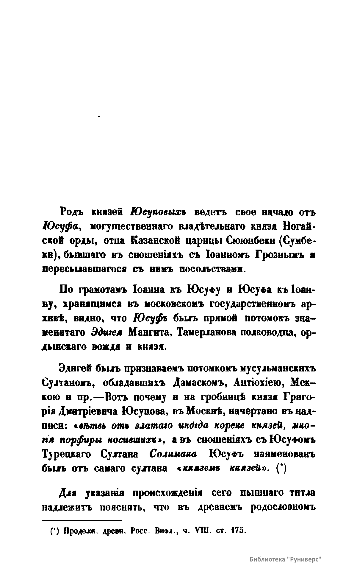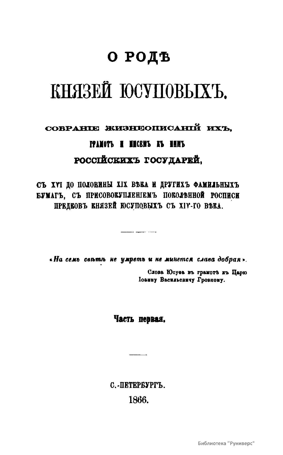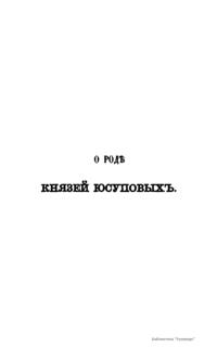 О родѣ князей Юсуповыхъ, собранiе жизнеописанiй ихъ, грамотъ и писемъ къ нимъ россiйскихъ государей, съ XVI до половины XIX вѣка и другихъ фамильныхъ бумагъ, съ присовокупленiемъ поколѣнной росписи предковъ князей Юсуповыхъ съ XIV-го вѣка
