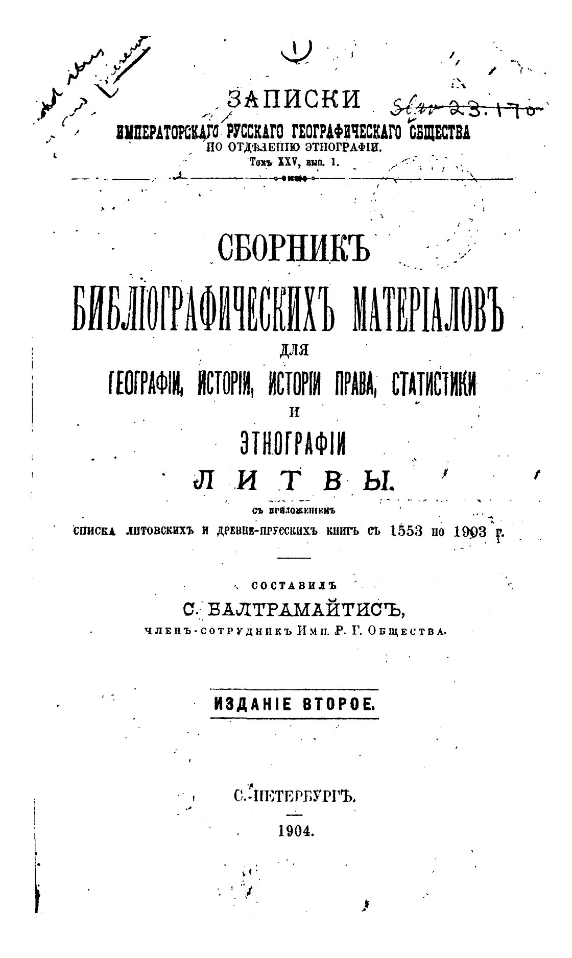 Сборникъ библiографическихъ матерiаловъ для географiи, исторiи, исторiи права, статистики и этнографiи Литвы с приложенiемъ списка литовскихъ и древнепрусскихъ книгъ съ 1553 по 1903 г