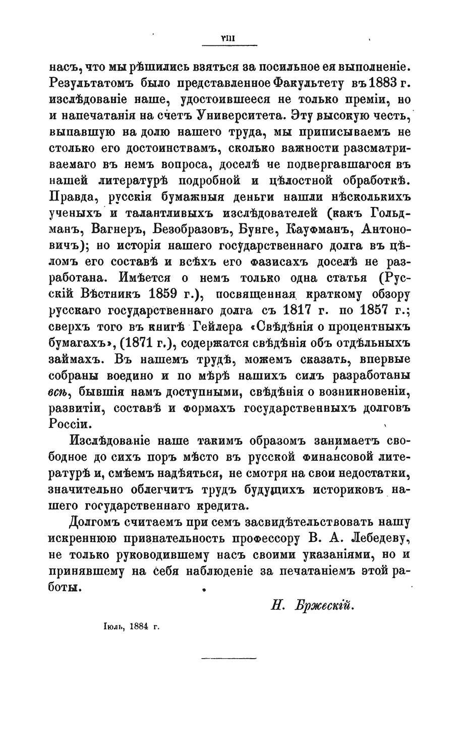 В своей первой большой научной работе, Н.К. Бржеский впервые собирает воедино и анализирует отрывочные сведения о возникновении, развитии, составе и формах государственных долгов России, начиная с долгов Московских государей и заканчивая имперскими займами второй половины XIX века.