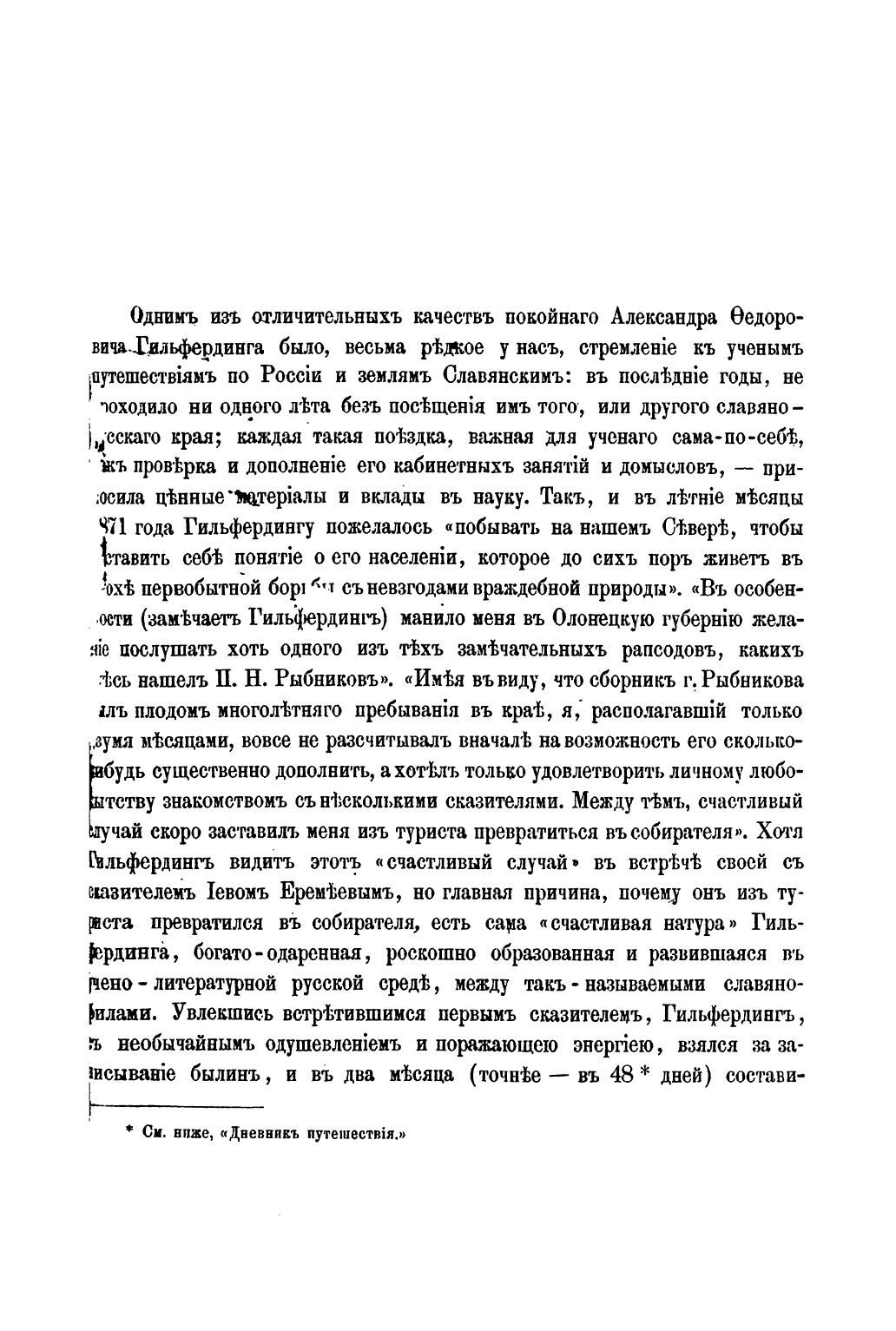 «Я, располагающий только двумя месяцами, вовсе не рассчитывал вначале на возможность его сколько-нибудь существенно дополнить [сборник Рыбникова], а хотел только удовлетворить личному любопытству, знакомством с некоторыми сказителями. Между тем счастливый случай скоро заставил меня из туриста превратиться в собирателя». За два месяца он прослушал 70 певцов и записал 318 былин (рукопись составила более 2000 страниц). Готовя материалы к публикации, Гильфердинг впервые применил метод воспроизведения былин в соответствии с репертуарами сказителей, предпосылая этим собраниям подробные биографические справки