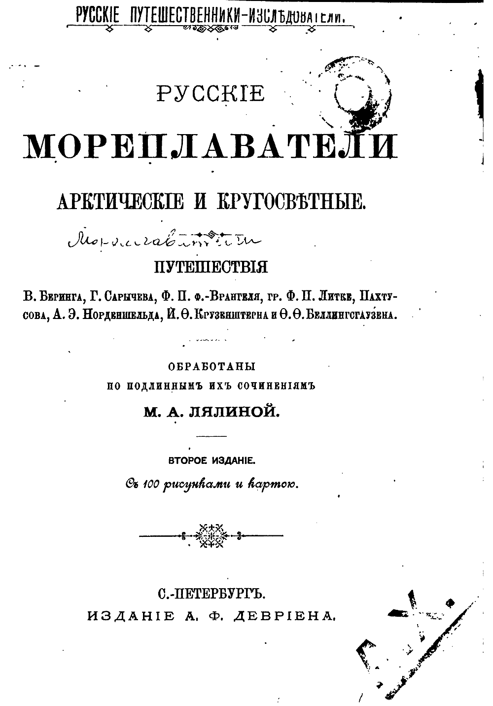 Русскiе мореплаватели арктическiе и кругосвѣтные. Путешествiя В. Беринга, Г. Сарычева, Ф.П. ф.-Врангеля, гр. Ф.П. Литке, Пахтусова, А.Э. Норденшельда, И.Ѳ. Крузенштерна и Ѳ.Ѳ. Беллинсгаузена