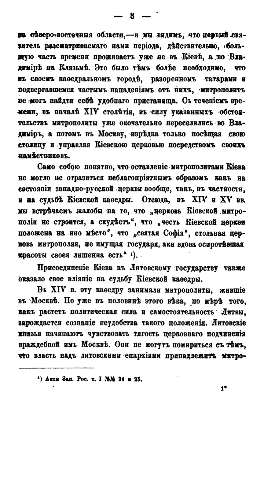В своей небольшой, но насыщенной фактами работе известный писатель и богослов В.П. Рыбинский детально изучает судьбу Киевской мирополичьей кафедры в период, когда Киев утратил свое главенствующее положение среди русских городов. Нашествие Батыя, а затем отпадение Киевского княжества от Северо-Восточной Руси, где сосредоточилась политическая и духовная жизнь страны привели к тому, что уже с XIII века митрополиты удалились из города. Присоединение Киева к Литовскому государству также не способствовало возрождению духовного центра. Литовские князья добились независимости киевской митрополии от Москвы, однако и теперь митрополиты продолжали управлять кафедрой через своих наместников, приведя к концу XVI века дела Киевской митрополии к полному разорению…