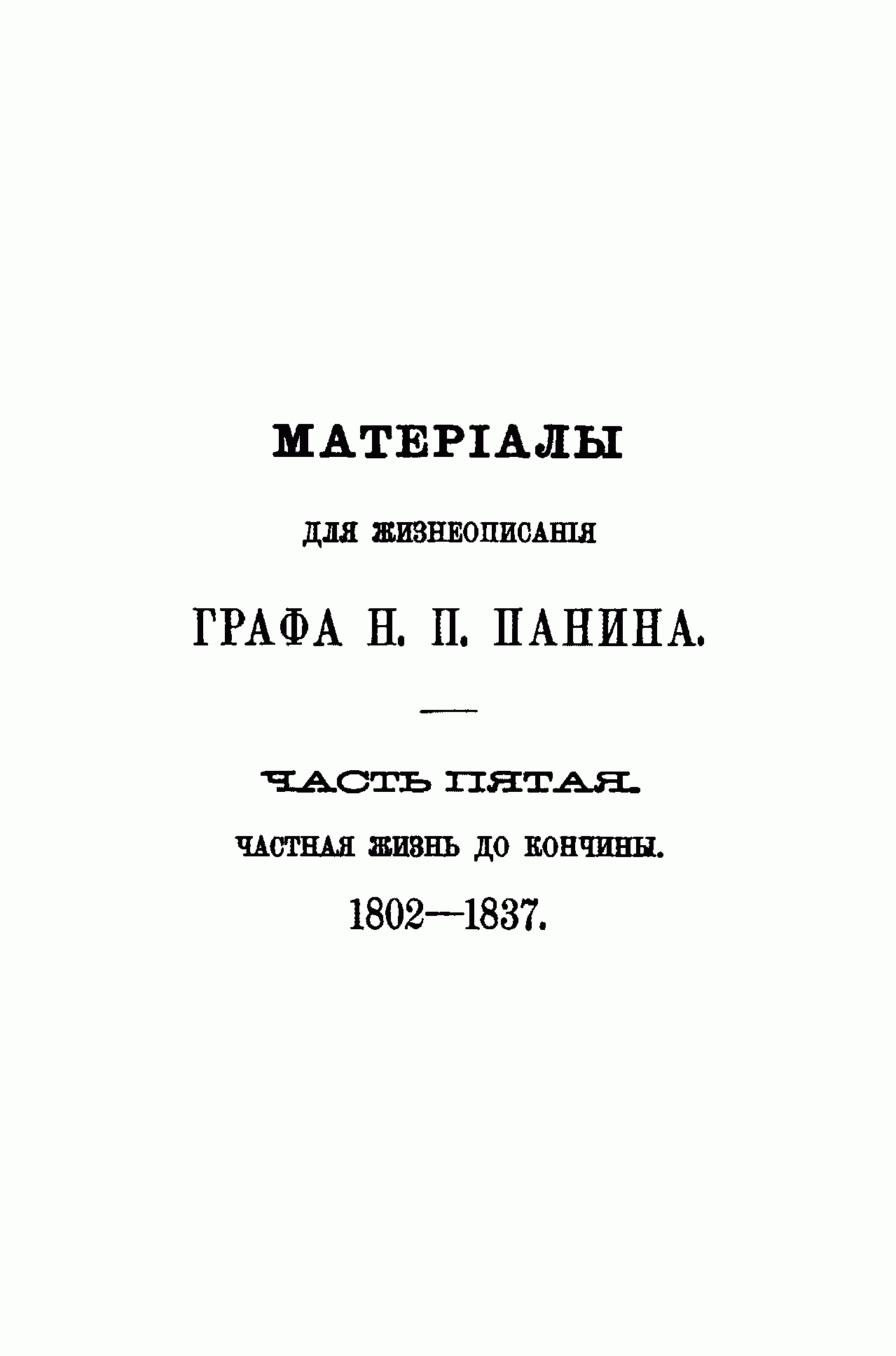 По поручению внучки Н. П. Панина, княгини М. А. Мещерской, А. Г. Брикнер с 1886 г. начал собирать и публиковать материалы для биографии графа. Последний, седьмой, том материалов посвящён частной жизни Панина с 1802 г. до его кончины в 1837 г. Здесь собраны сведения о путешествии графа в Финляндию в 1802 г.; о путешествии по Европе и окончательной опале (1802 – 1804); об участии в устройстве ополчения в Смоленской губернии (1806 – 1807); о деле с Ростопчиным (1813 – 1814); о жизни в Дугине (1816 – 1837), а также различные письма и записки. Большая часть документов написана по-французски.