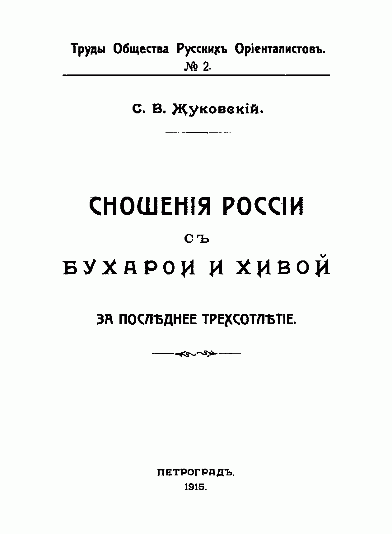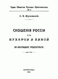 Книга отечественного востоковеда С.В. Жуковского является одним из первых систематических справочных изданий по истории взаимоотношений России с государствами Центральной Азии – Бухарским эмиратом и Хивинским ханством на протяжении трёх столетий (в XVII – XIX вв.). Книга построена в форме аннотированной хронологической таблицы с приложениями документальных материалов – договоров, соглашений и меморандумов. В следующем году им был выпущен труд «К истории сношений России с Бухарой и Хивой конца XVIII в. Посольство переводчика Бекчурина в Бухару в 1781 г.» – (Восточный сборник. Вып. 2.)