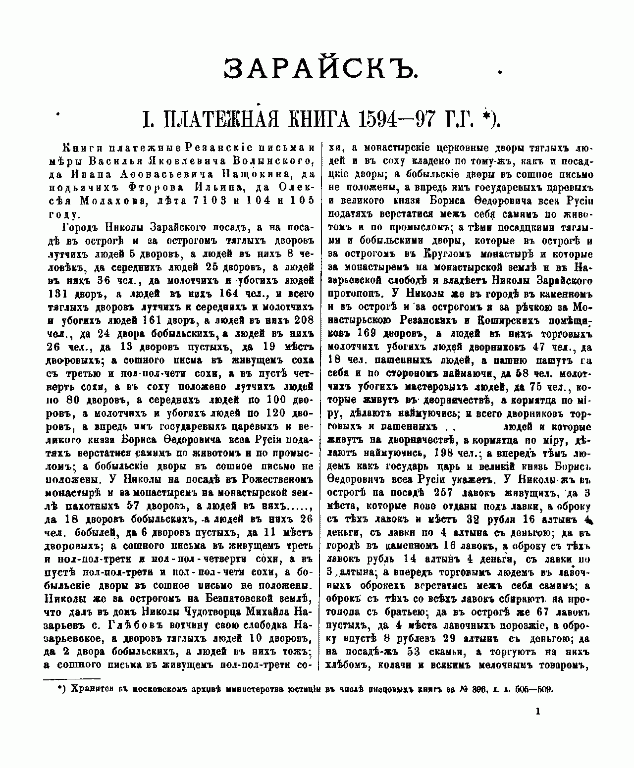 Публикация документов XVI – XVIII вв. осуществлена на средства московских купцов Бахрушиных и Сорокоумовского, род которых происходил из города Зарайска. В книге представлены: платёжная книга 1591 – 1597 гг., писцовая книга 1625 г., переписная книга 1646 г., описи 1687 – 1707 гг., переписная книга 1715 г., книга 2-й ревизии, ведомость 1776 г. Особый интерес представляет описание города и уезда 1776 года, которое позволяет читателю погрузиться в атмосферу того далёкого времени.