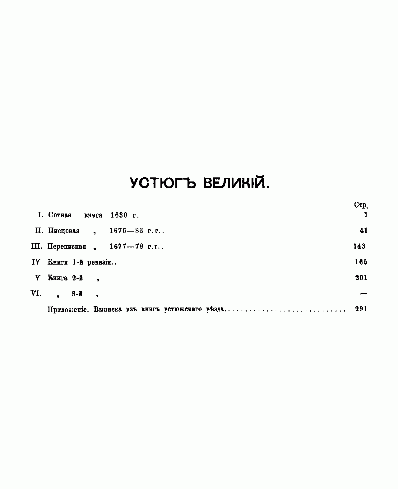 Публикация исторических документов XVII и XVIII вв. осуществлена на средства иркутского купца первой гильдии А. К. Трапезникова, род которого происходил из устюжского уезда. В книге опубликованы: сотная книга 1630 г., писцовая книга 1676 – 1683 гг., переписная книга 1677–1678 гг., книги 1-й, 2-й и 3-й ревизии, а также выписка из книг устюжского уезда.