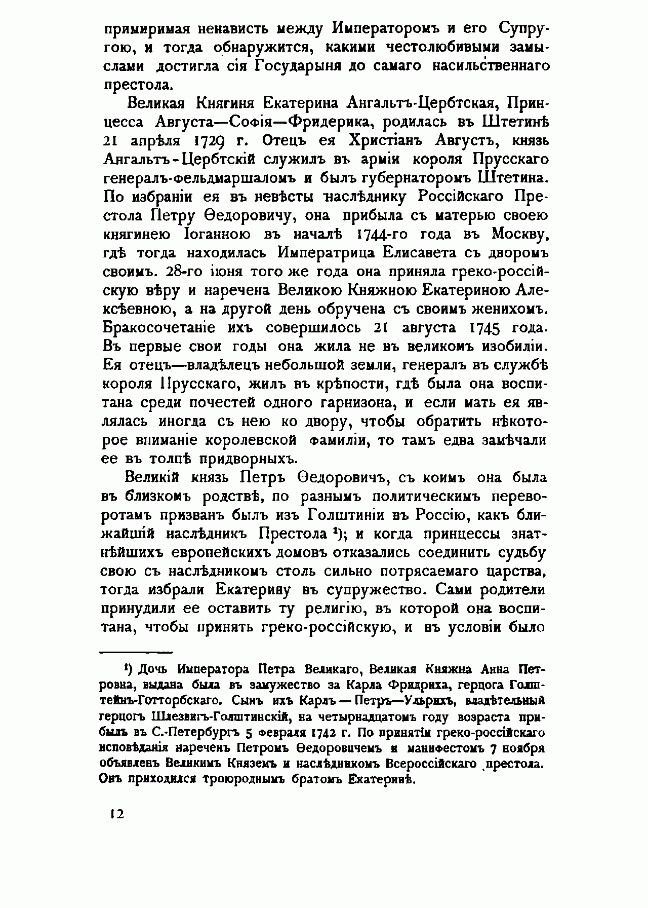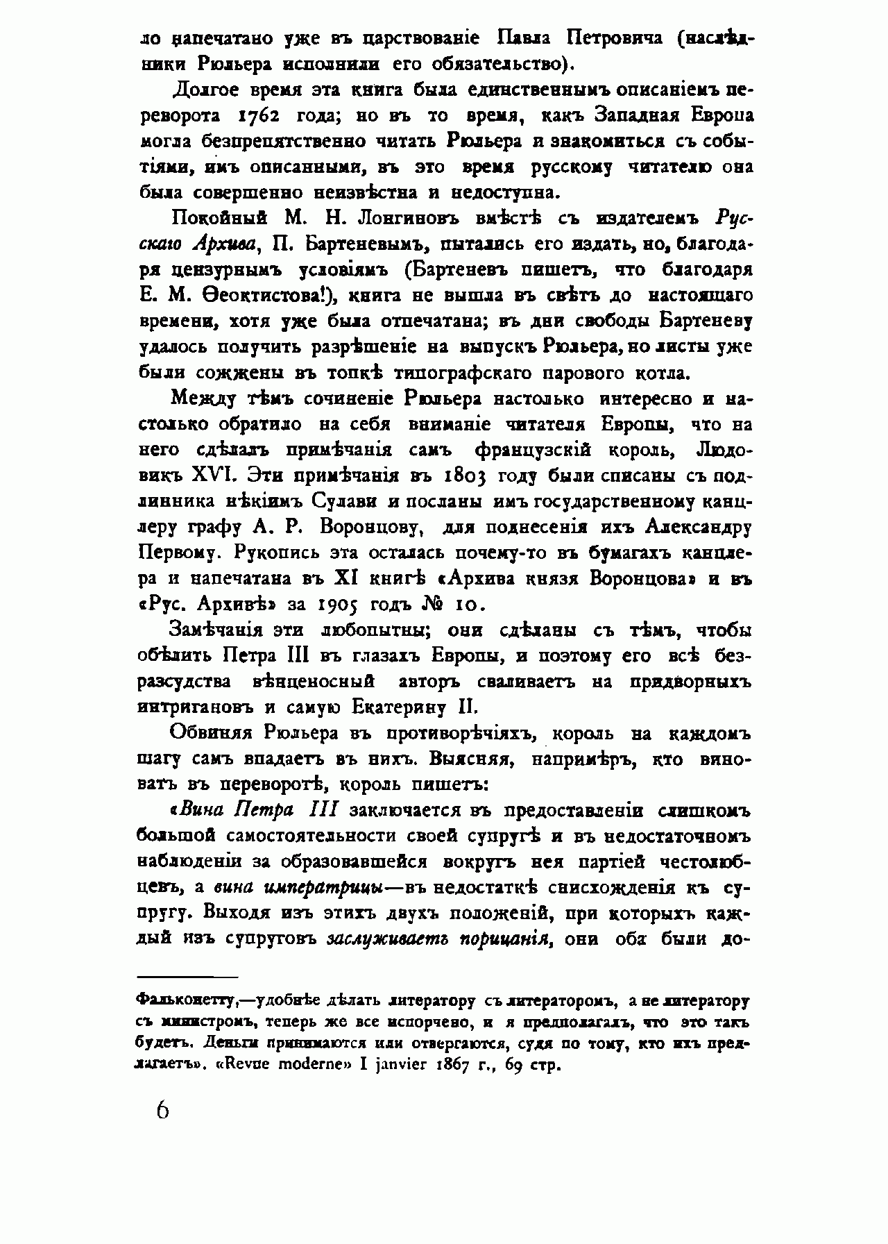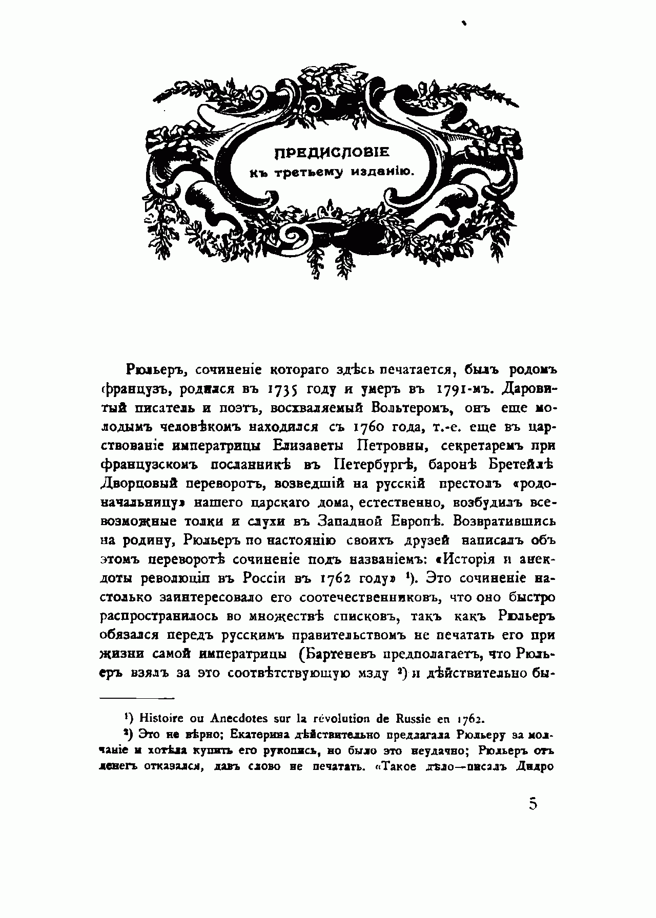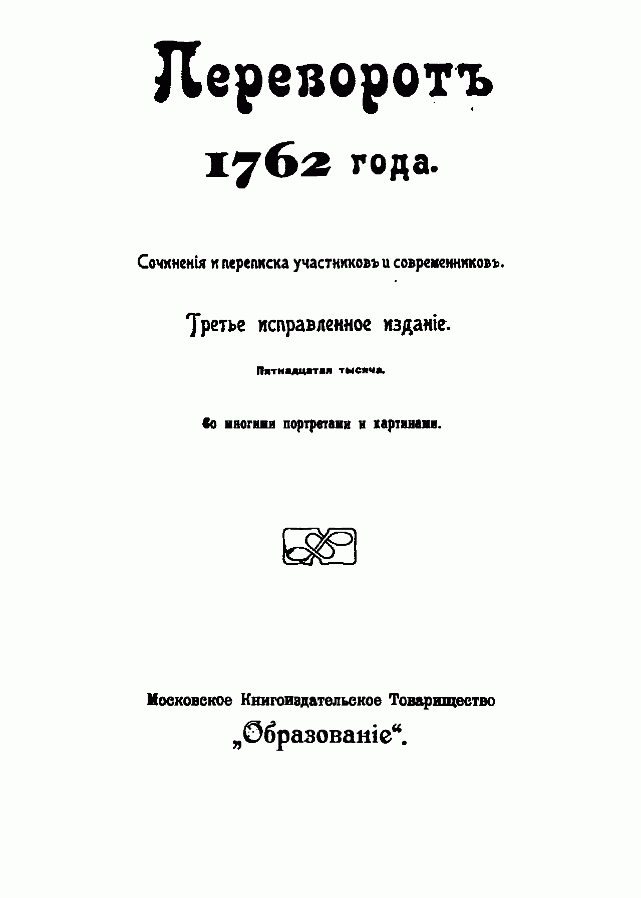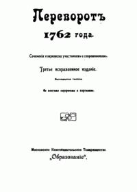 Публикация сочинения секретаря французского посла в России Рюльера о ходе подготовки и осуществлении дворцового переворота 1762 г., приведшая на трон Екатерину II, дополненная многочисленными письмами и воспоминаниями современников. Это издание имело огромную популярность.