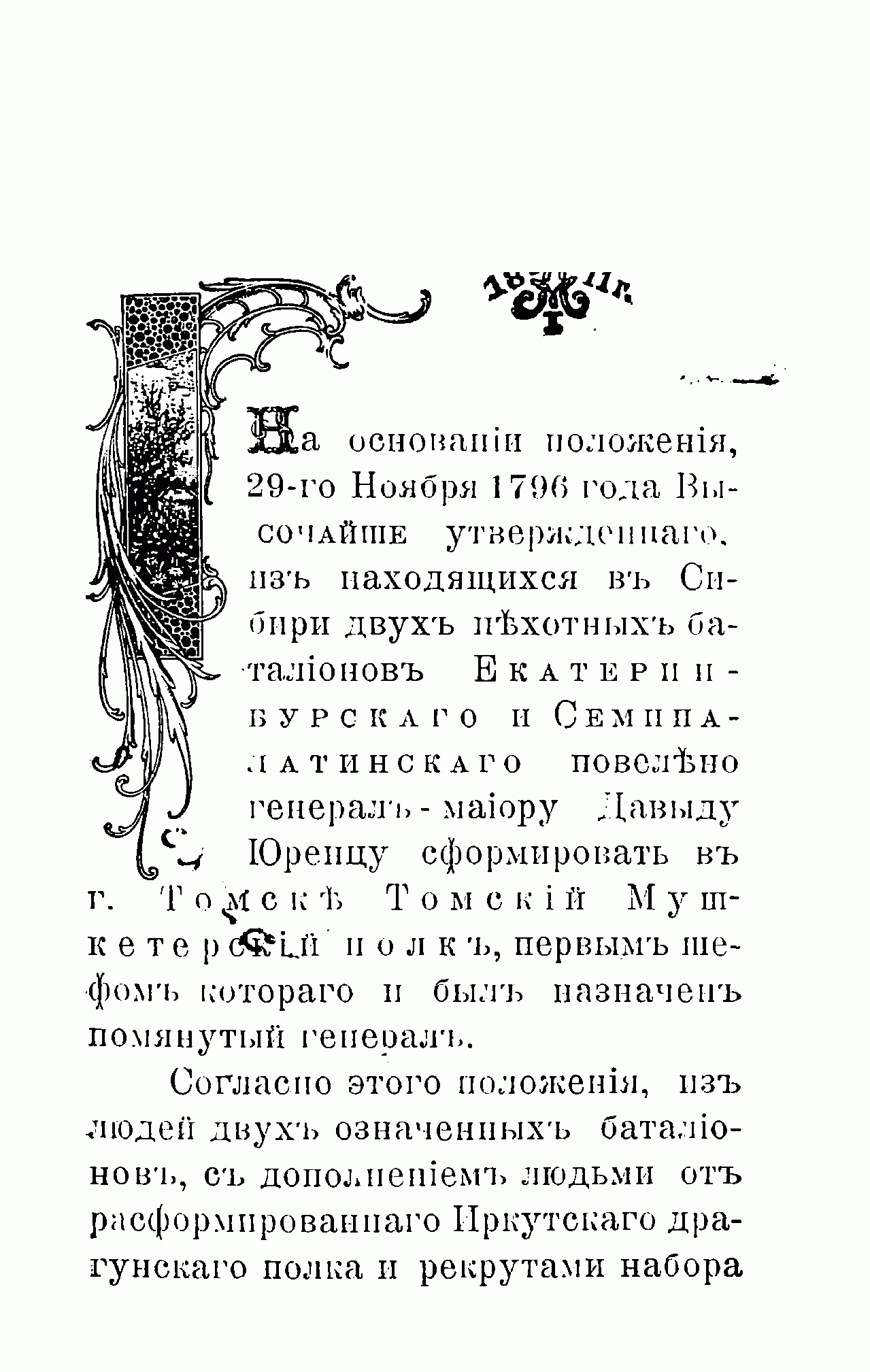 Полковая хроника составлена в связи с празднованием 100-летия 39-го Томского пехотного полка. Двухбатальонный Томский мушкетерский полк был сформирован 29 ноября 1796 года в Томске из Екатеринбургского и Семипалатинского полевых батальонов. Летом 1808 г. полк навсегда покинул Томскую губернию и был переведен в Омск, откуда вместе с остальными сибирскими полками начал длительный поход на запад – в Волынскую губернию, куда прибыл в сентябре 1809 г. С тех пор он постоянно дислоцировался на западных рубежах России. За долгие годы своей истории полк принимал активное участие в Отечественной войне 1812 года, русско-турецкой войне 1828–1829 г., в венгерском (1849 г.) и польском (1863 г.) походах, внёс большой вклад в оборону Севастополя в ходе Крымской войны. С 1864 г. несколько раз менял свою дислокацию в юго-западных областях России, однако участия в боевых действиях вплоть до Первой мировой войны не принимал.