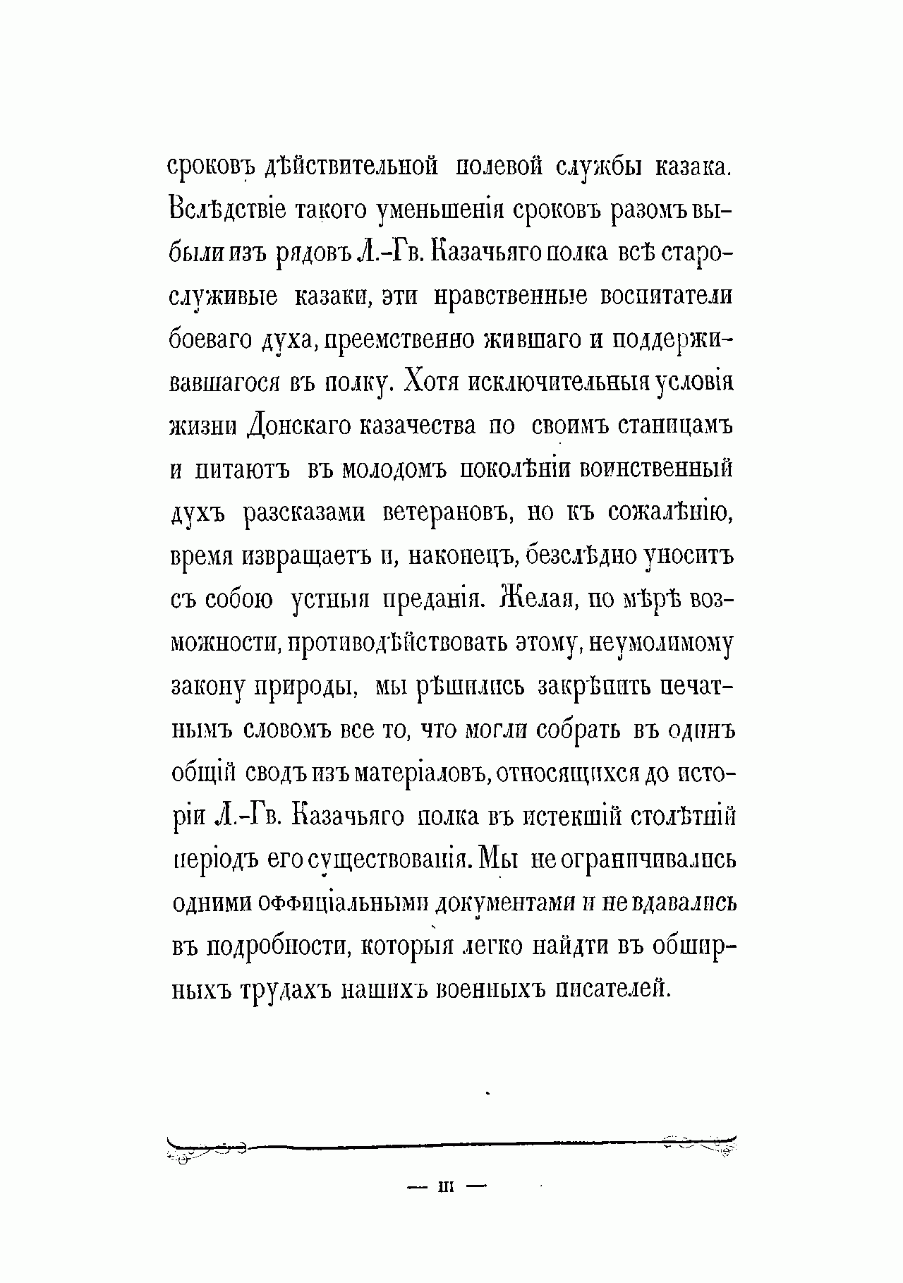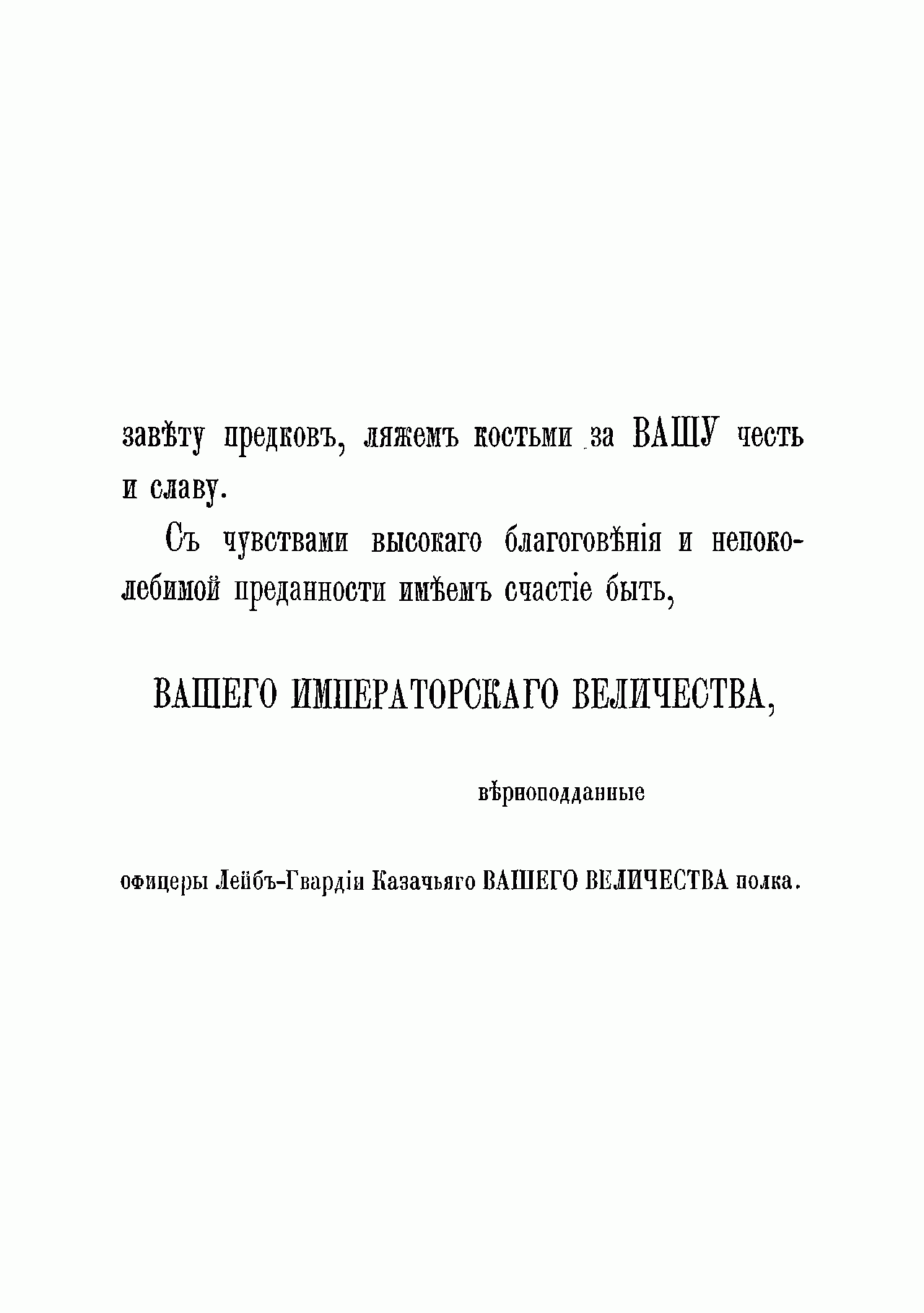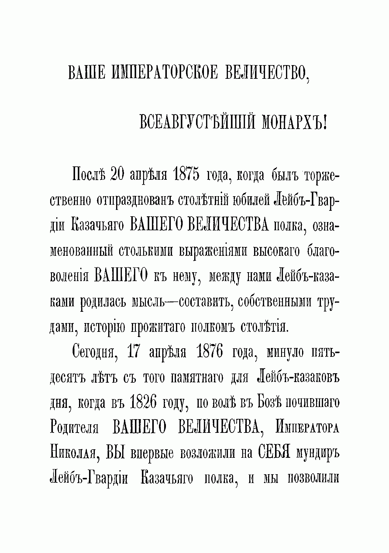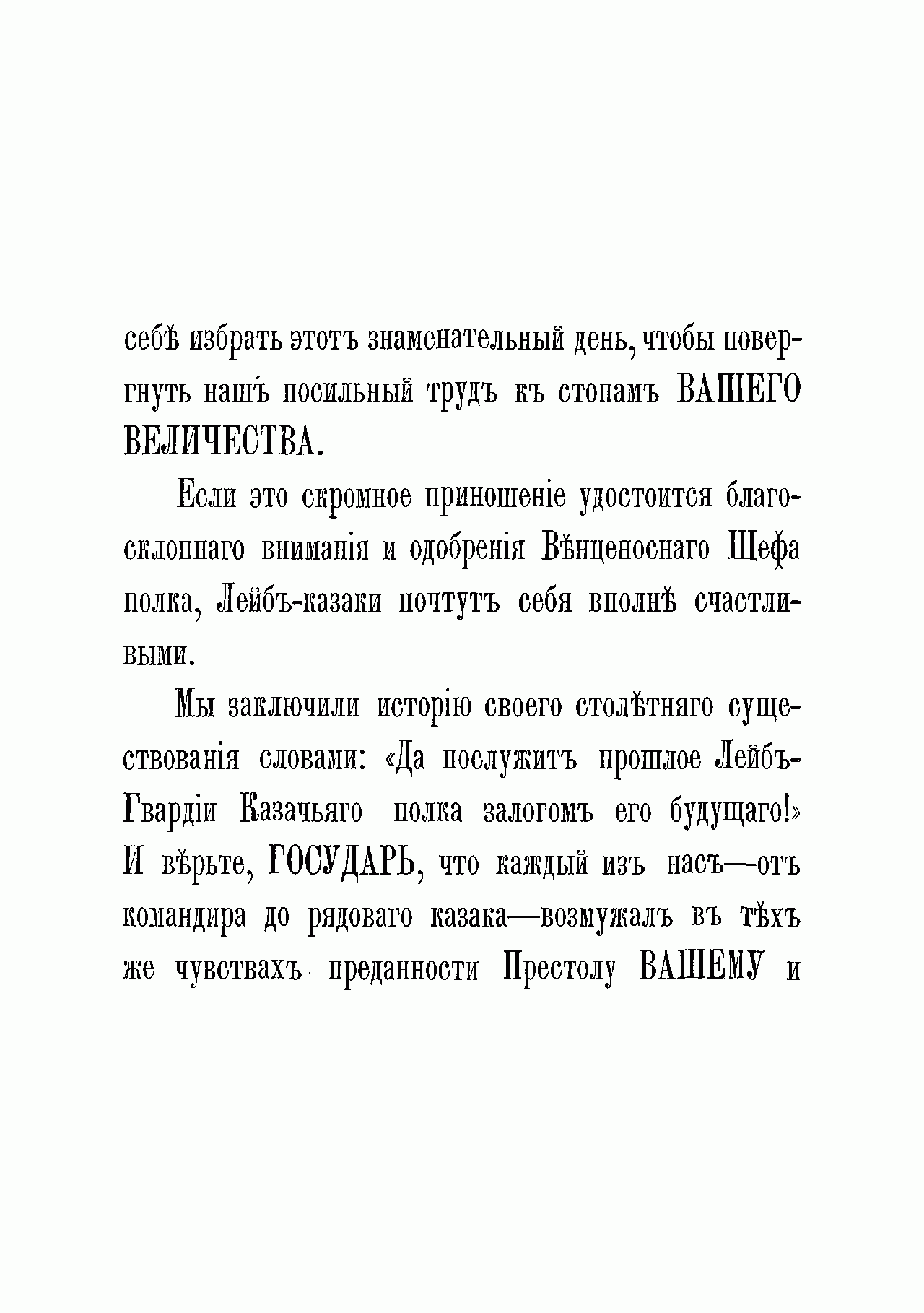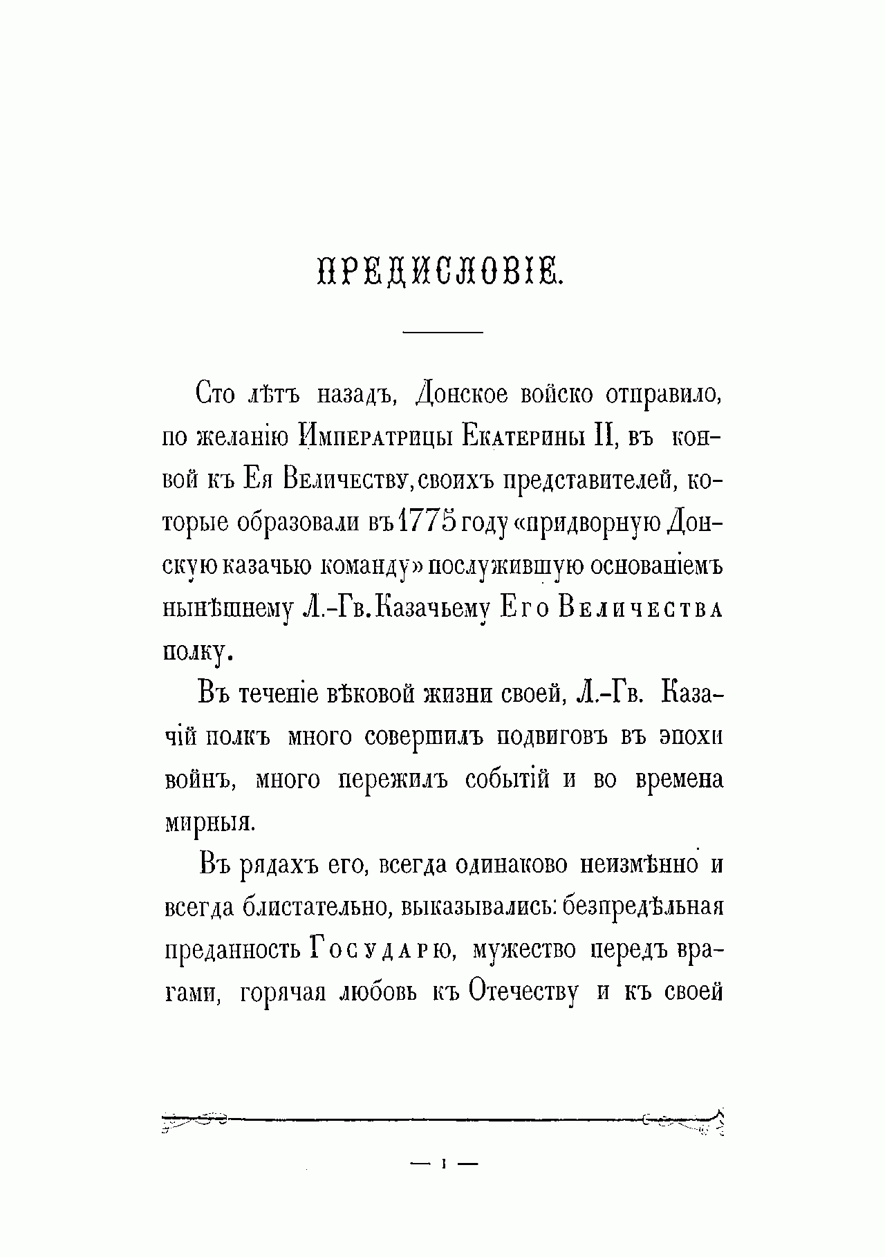 Фундаментальная история полка подготовлена его офицерами в связи с празднованием 100-летнего юбилея и 50-летием шефства над полком особы императора. Лейб-гвардии казачий полк ведет свою историю от Донской казачьей команды, присланной к императорскому двору 20 апреля 1775 г. в правление Екатерины II. Инициатива в создании этого формирования исходила от князя Г.И. Потемкина, предложившего отправить в Москву на празднование годовщины Кучюк-Кайнаджирского мира две команды знатных казаков с Дона, которые и сформировали собственный императорский конвой, с 1776 г. получивший название «Донская придворная команда». После восшествия на престол Павла I в 1796 г. придворные казачьи команды объединены с казачьим полком гатчинских Его императорского высочества наследника цесаревича войск (этот полк был учрежден в 1793 г.), переформированы в два эскадрона, и составили половину Лейб-Гусарского Казачьего полка, которому были пожалованы права и преимущества гвардии. Через два года этот полк был разделен на два полка и с 1798 г. образован Лейб-гвардии Казачий полк. В 1805 г. в составе конной гвардии полк участвовал в сражении под Аустерлицем, где отбросил кавалерию французов, оказав помощь лейб-гусарам и кавалергардам, прикрывавшим гвардейскую пехоту, а затем в составе арьергарда П.И. Багратиона до поздней ночи прикрывал отступление русской пехоты. Впоследствии полк принимал активное участие в русско-шведской войне за Финляндию и Отечественной войне 1812 г., а также в заграничных походах. Интересен тот факт, что отряд лейб-гвардейцев казаков конвоировал Наполеона на о. Эльба в 1814 г. В царствование Николая I полк участвовал в русско-турецкой войне 1828–1829 гг. и подавлении польского восстания 1830–1831 гг. В период Крымской войны полк отвечал за безопасность двора и прикрывал побережье Финского залива. Основными функциями полка в 30-х- 70-х гг. XIX столетия были в основном придворно-церемониальные.