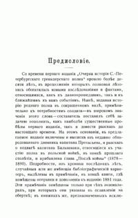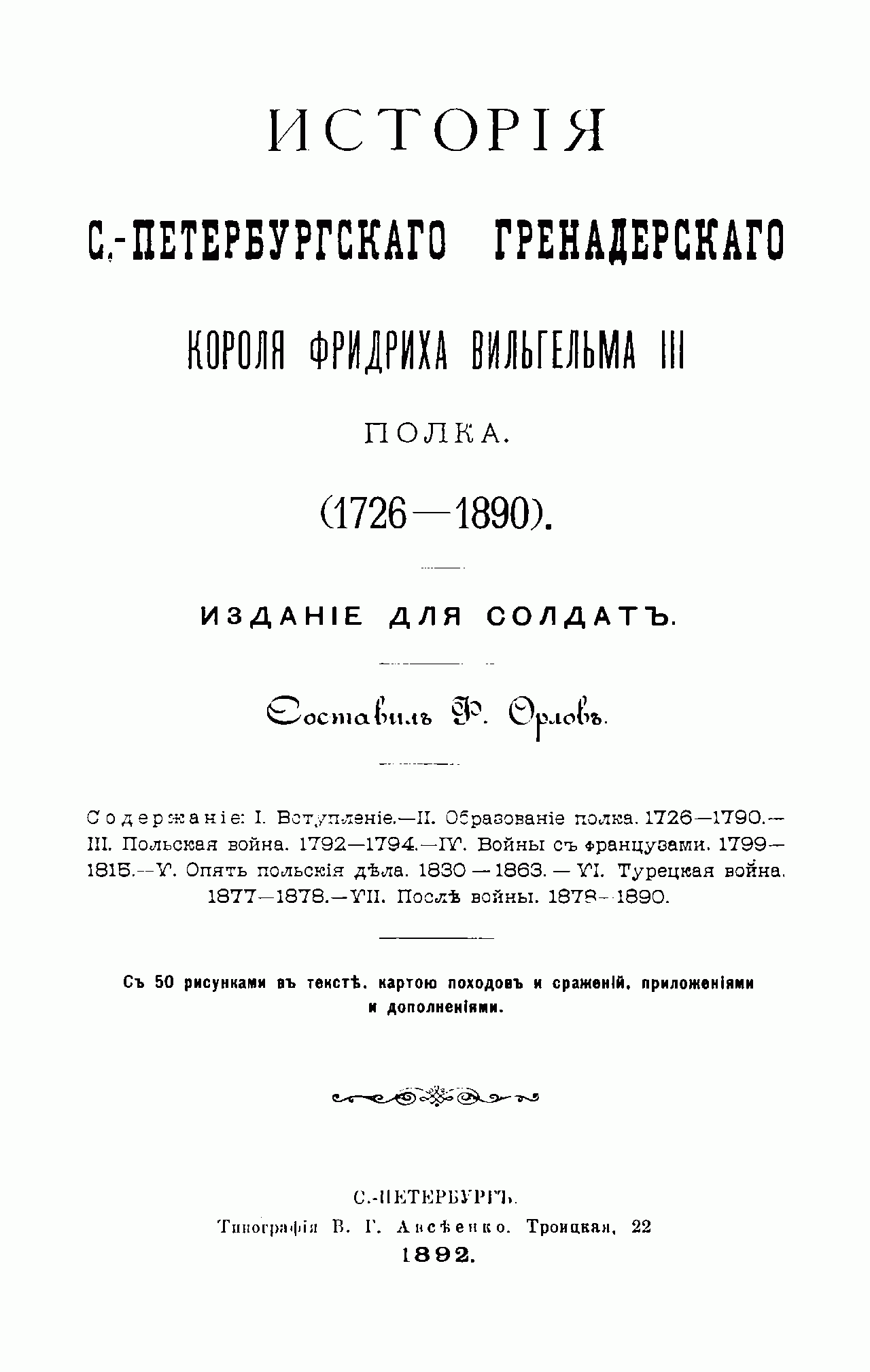 Данное издание представляет собой сжатый, популярный очерк истории Санкт-Петербургского гренадерского короля Фридриха Вильгельма III-го полка, подготовленный генералом Ф.Ф. Орловым для нижних чинов, написанный им на базе изданной за десять лет до этого подробной полковой истории. Создание этого полка связано с продвижением российских войск в Прикаспии и проведением Персидского похода в конце царствования Петра Великого. В 1726 г. было приказано в так называемом «Низовом корпусе» сформировать именной фон Лукиева полк в составе 1 гренадерской и 7 фузелерных рот. В дальнейшем полк неоднократно переименовывался и носил имена своих командиров. Однако, с 1801 г. он стал носить название Санкт-Петербургский, а после заграничных походов и разгрома Наполеона в Европе, полку было присвоено почётное имя короля Прусского, а затем он был причислен к лейб-гвардии.