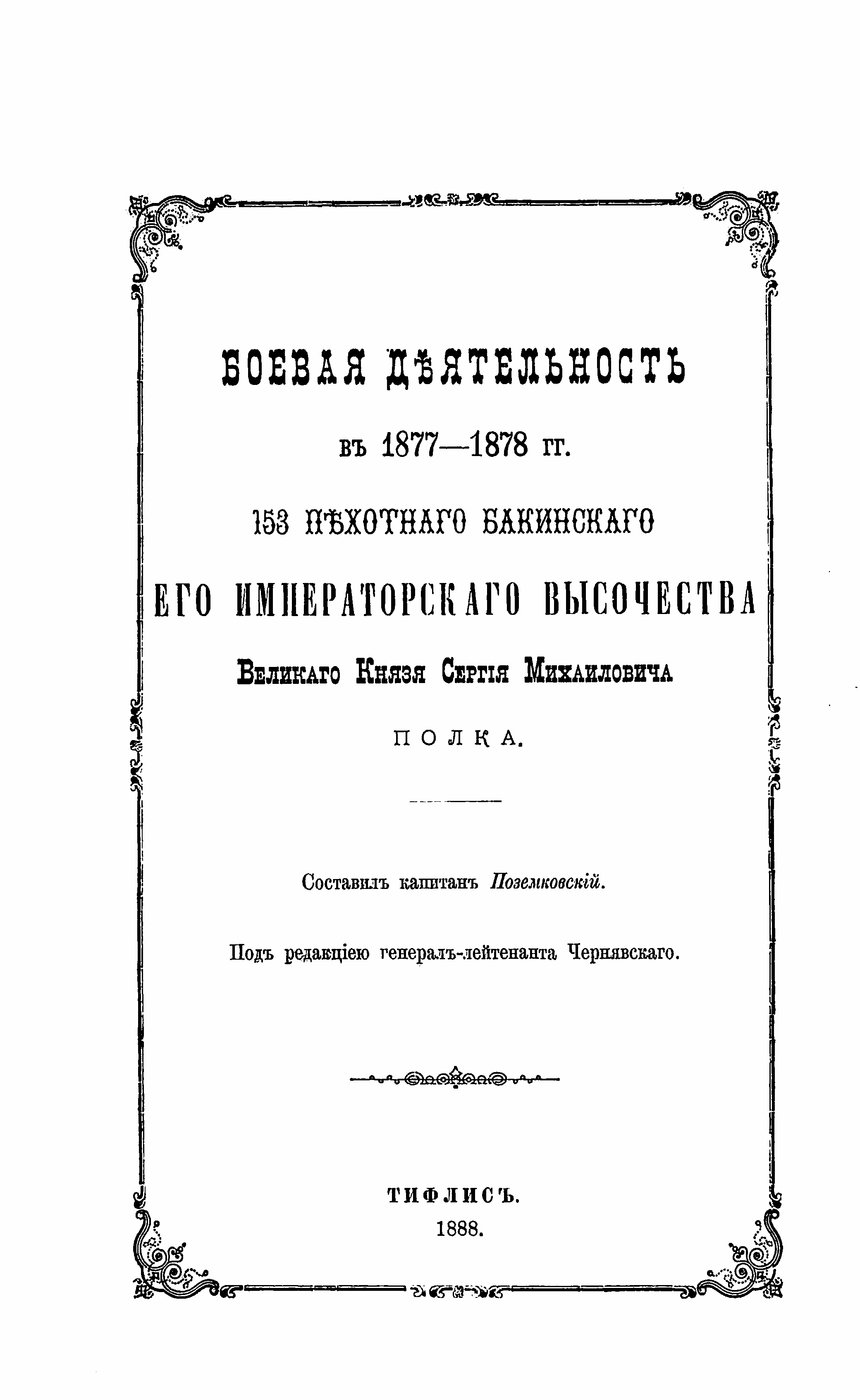Данное издание специально подготовлено в рамках деятельности по сбору, обработке материалов и обобщению опыта боевых действий в период русско-турецкой войны 1877-1878 гг. на Кавказском ТВД, которая была поручена в 1886 г. военно-историческому отделу штаба Кавказского военного округа, возглавлявшемуся генерал-лейтенантом И. С. Чернявским. Краткий очерк боевых действий 153-го пехотного Бакинского Его мператорского Высочества Великого Князя Сергея Михайловича полка, сформированного в 1863 г. из резервных – батальона Крымского полка и Кавказского батальона, посвящён описанию его боёв в составе Кавказской армии, в колонне командира Елизаветпольского полка полковника князя М.К. Амираджибова. В ходе выдвижения от Ахалкалаки полк 4 мая 1877 г. взял в районе турецкой крепости Ардаган Гюлавердынские высоты, а на следующий день – укрепление Ахали. Другим важным сражением для бакинцев было взятие форта Азизие, в ночь на 28 октября 1877 г. Овладение этим фортом должно было находиться в связи с одновременным взятием трёх остальных фортов, защищавших подступы к городу-крепости Эрзерум. Однако боевая задача выполнена была только одним Бакинским полком, взобравшимся на вал по штурмовым лестницам и овладевшим укреплением после ночного штыкового боя. На следующее утро, из-за отсутствия поддержки, полку пришлось отступить, причём отступление проходило под натиском противника и его сильным огнем. Несмотря на это, полку удалось захватить до 600 пленных, взятых ночью. Помимо этого полк отличился: 12 августа 1877 г. — при занятии Аббас-Гельского перевала, 8 сентября — в бою за селение Чарухчи, 19 и 20 сентября — при наступлении против Кизил-Гула, 2 и 3 октября — при взятии Авлиара и Визинкейских высот и 23 октября — при атаке укреплённой позиции Деве-Бойну. Эти события детально изложены в представленном очерке. В приложениях содержатся поименные списки офицеров и нижних чинов полка, раненных и убитых в ходе боевых действий.