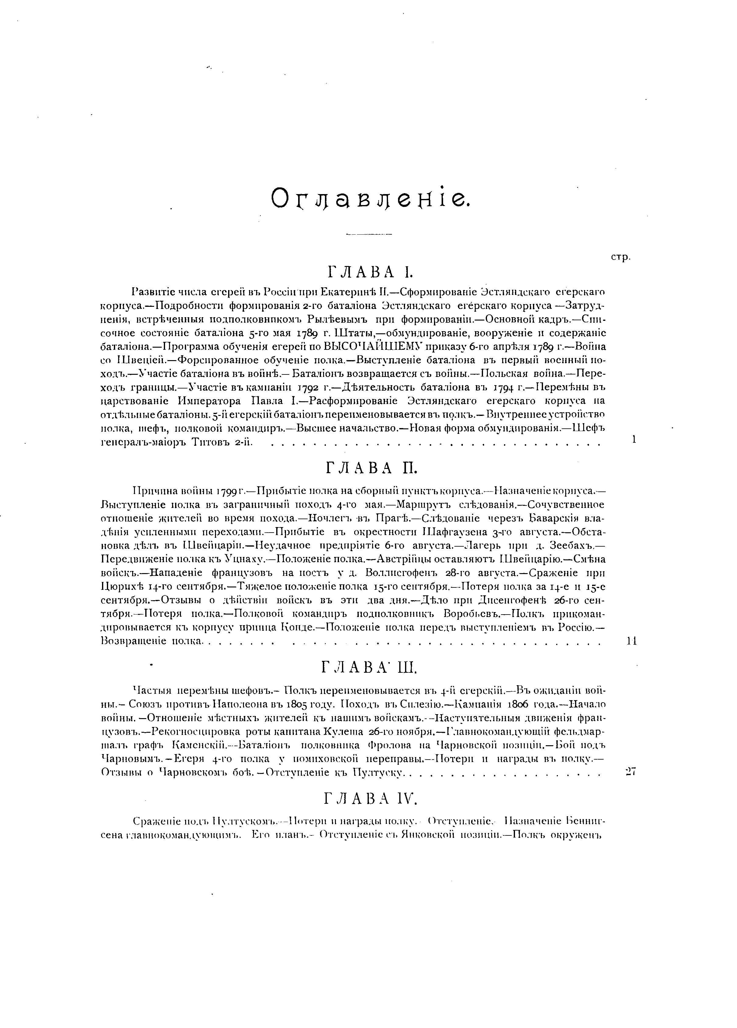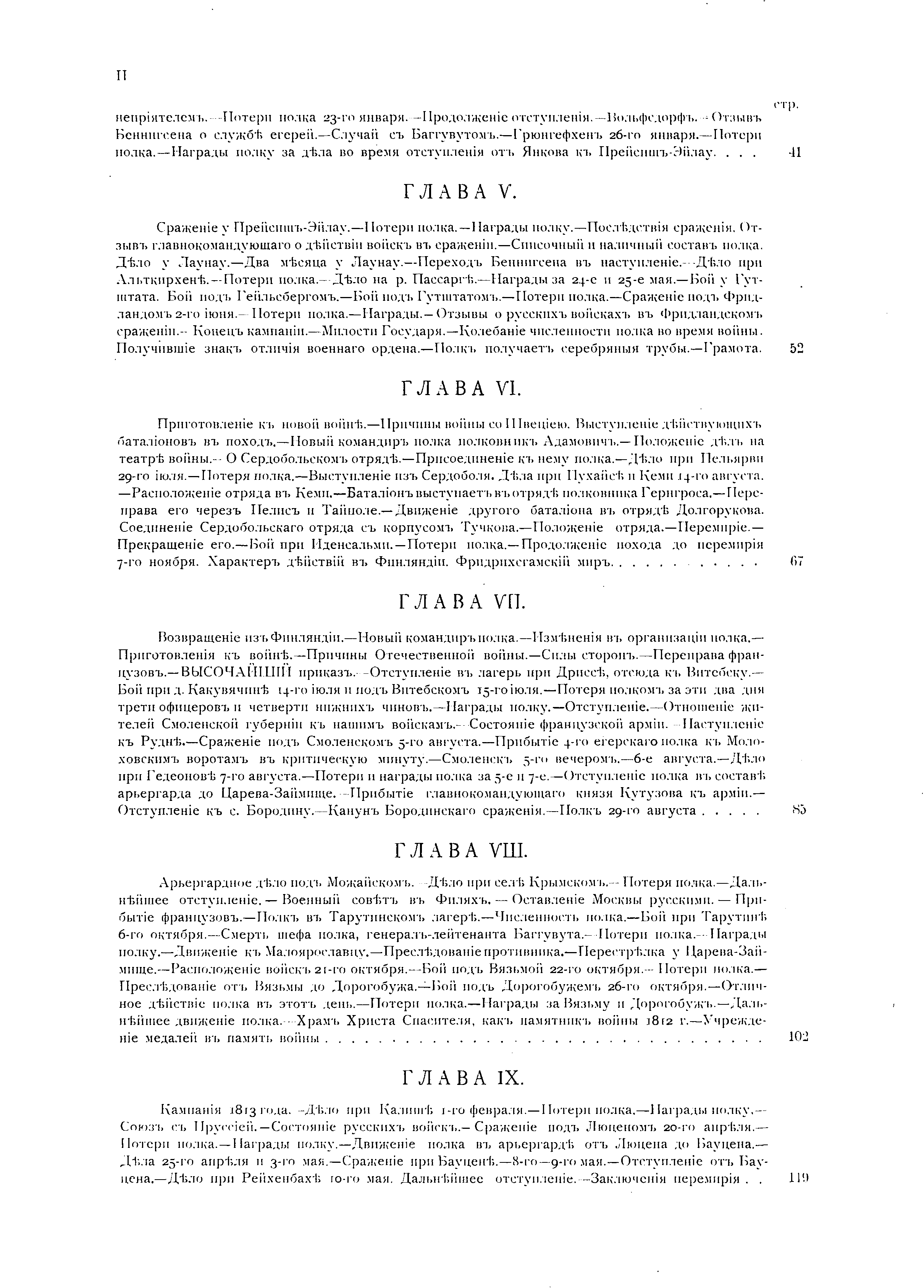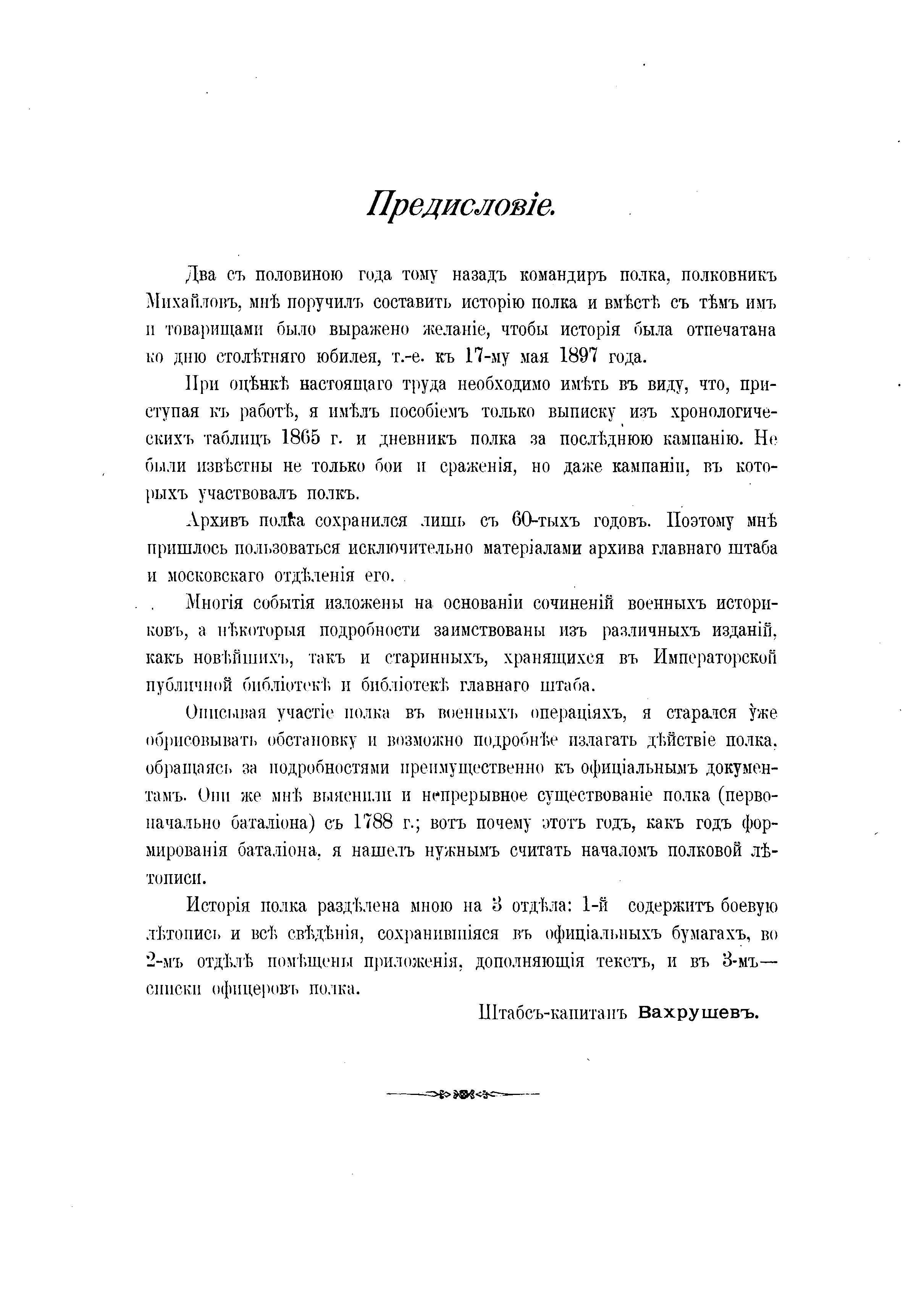 Документальное описание боевых действий полка и знаменательных исторических событий, связанных с ним, за период 1788 – 1897 годов. Приведены поименные полковые списки личного состава, списки награжденных и отличившихся в разных кампаниях (с указанием наград), списки шефов, командиров и офицеров полка, боевой формуляр полка, подробное описание обмундирования, вооружения, снаряжения и т.п.