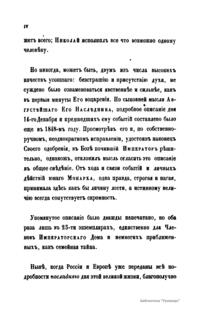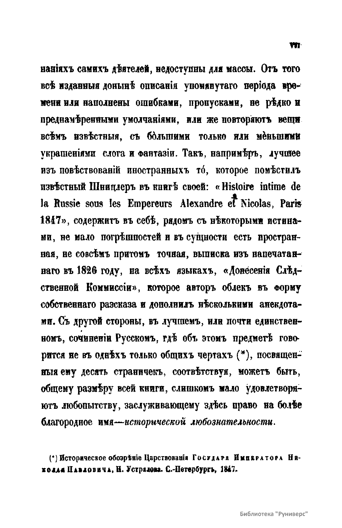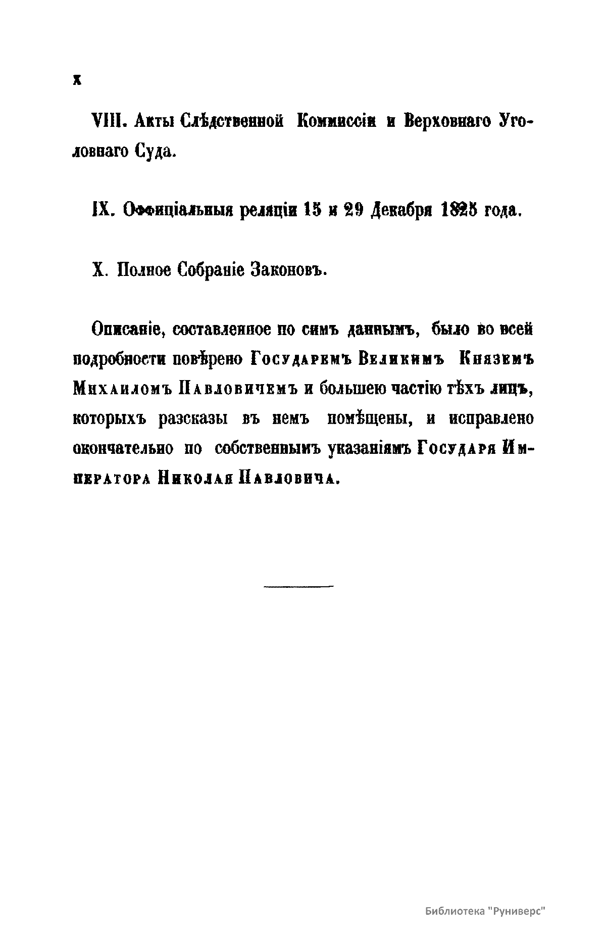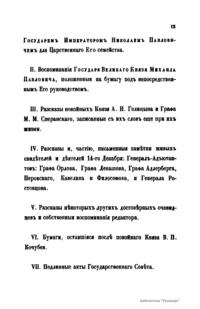 Николай I (1796 – 1855), российский император с 1825 г., третий сын Павла I. При составлении настоящего издания автор пользовался следующими источниками: I. Собственноручная подробная записка, написанная Николаем I для II. Воспоминания великого князя Михаила Павловича. III. Рассказы князя А.Н. Голицына и графа М.М. Сперанского. IV. Рассказы и частью письменные заметки живых свидетелей и деятелей 14 Царственного семейства. декабря: генерал-адъютантов графа Орлова, графа Левашова, графа Адлерберга, Перовского, Кавелина и Философова, генерала Ростовцева. воспоминания редактора. V. Рассказы некоторых других достоверных очевидцев и собственные VI. Бумаги князя В.П. Кочубея. VII. Подлинные акты Государственного совета. VIII. Акты Следственной комиссии и Верховного уголовного суда. IX. Официальные реляции 15 и 29 декабря 1825 г. X. Полное собрание законов.