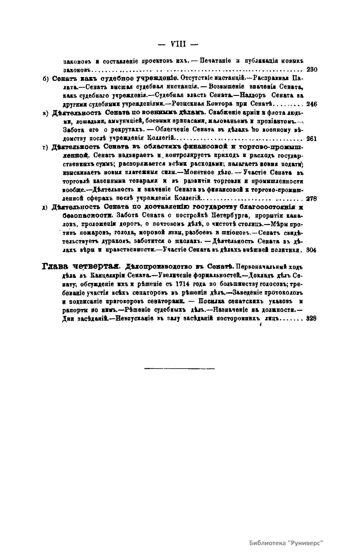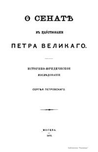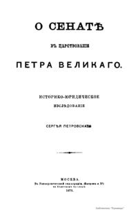 Сенат (1711 – 1917), высший государственный орган, подчиненный императору. Учрежден Петром Великим как высший орган по делам законодательства и государственного управления. С первой половины XIX века высший судебный орган, осуществлял надзор за деятельностью государственных учреждений и чиновников. По Судебным уставам 1864 г. высшая кассационная инстанция. Автор настоящего издания ограничивает свой труд временем Петра. Он считает, что это самая интересная эпоха в истории Сената: в это время он учреждается, растет, развивается и окончательно получает то значение и организацию, с которыми переходит к его преемникам. В книге говорится: о происхождении, развитии и значении Сената; составе Сената; круге ведомства Сената; о делопроизводстве Сената. В своей работе автор пользовался историческими и историко-юридическими сочинениями, а также Полным собранием законов и подлинными делами Сената.