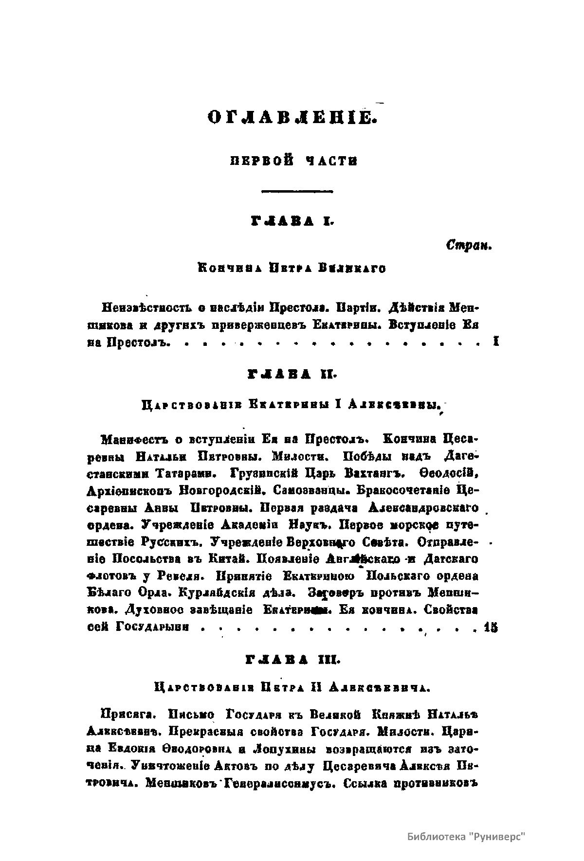 В первой части настоящего издания автор рассказывает о кончине Петра Великого; царствовании Екатерины I Алексеевны; царствовании Петра II Алексеевича; о начале царствования Анны Иоанновны. Вторая часть посвящена царствованию Анны Иоанновны. В третьей части говорится о правлении Бирона и о правлении великой княгини Анны Леопольдовны.