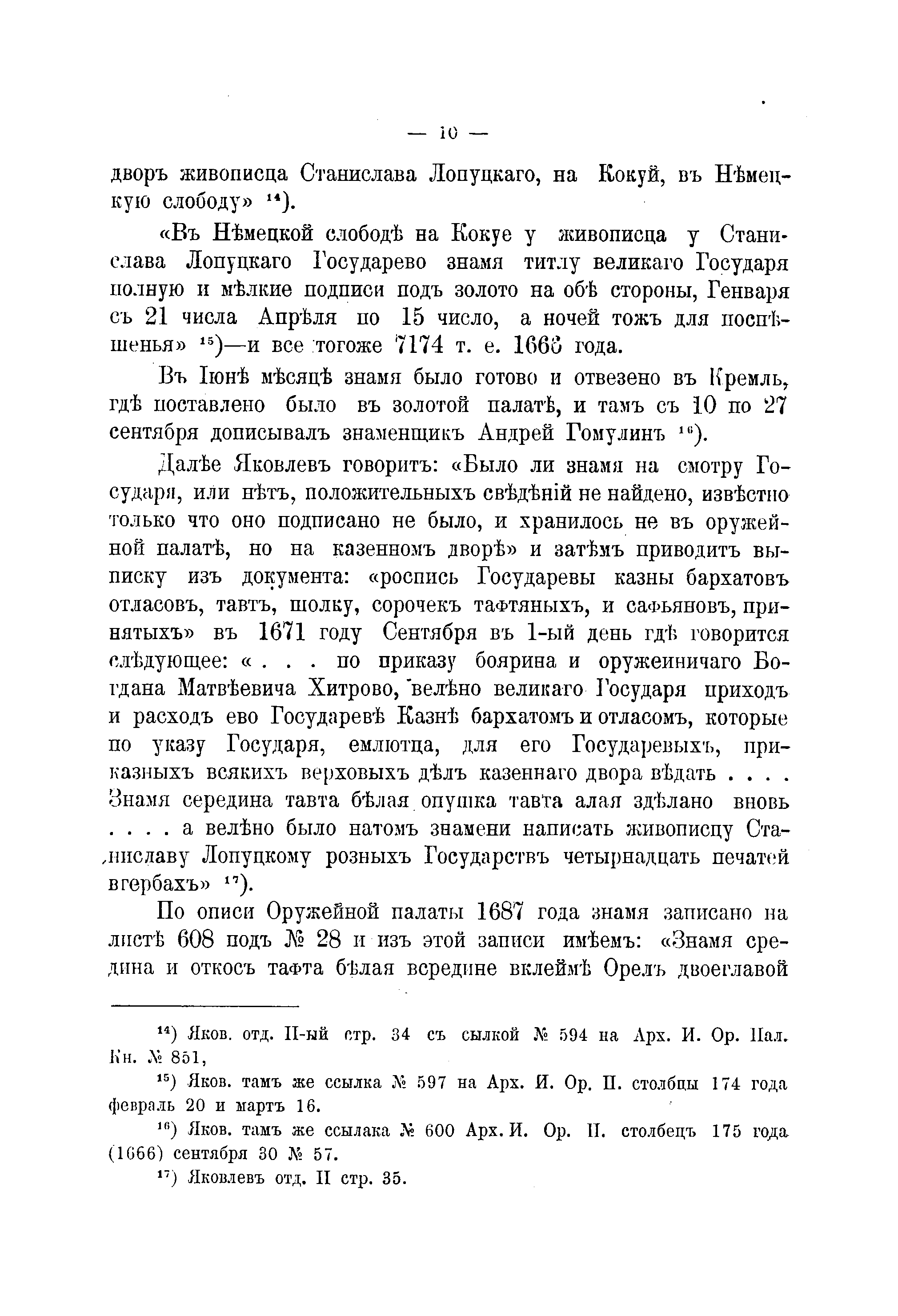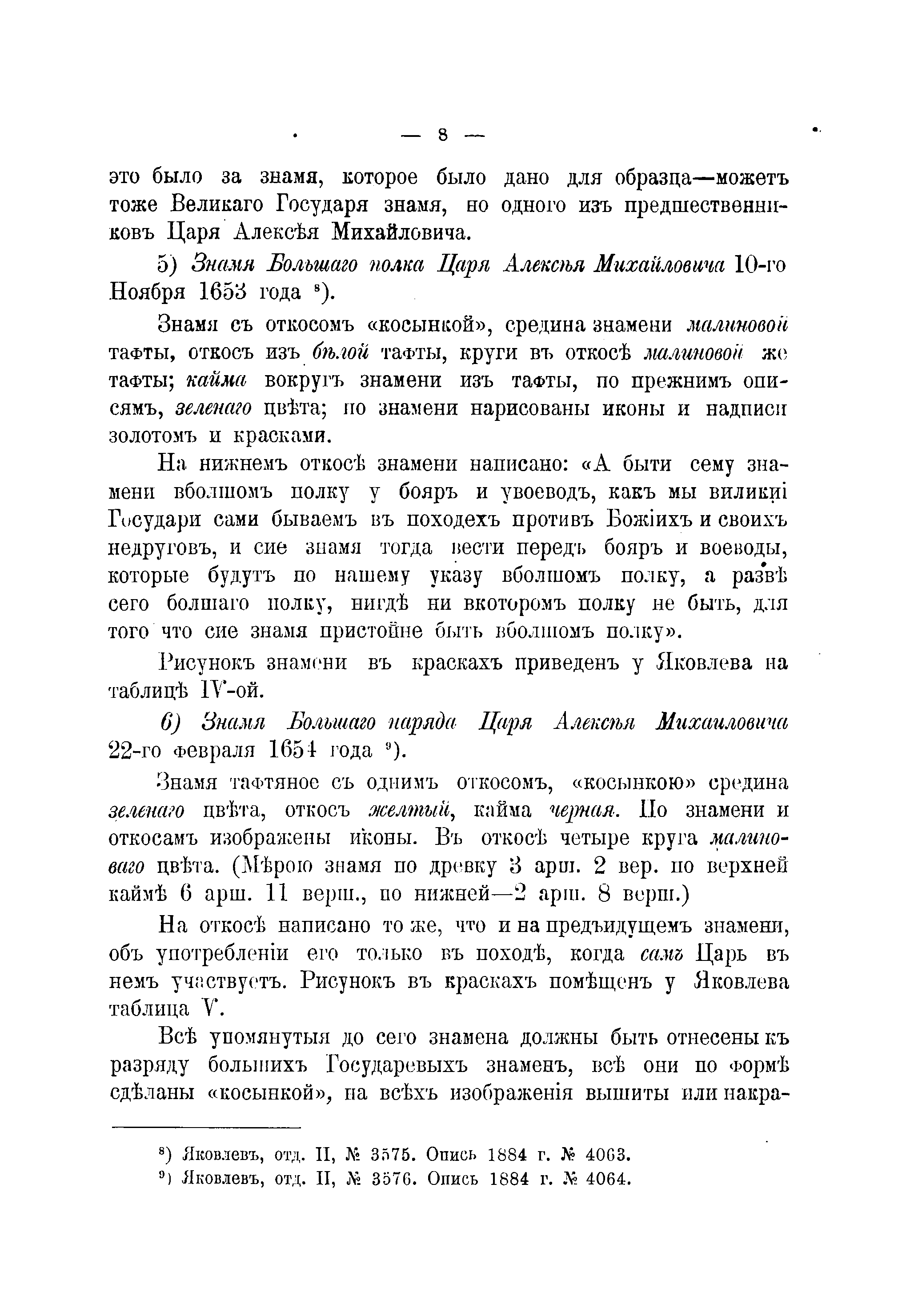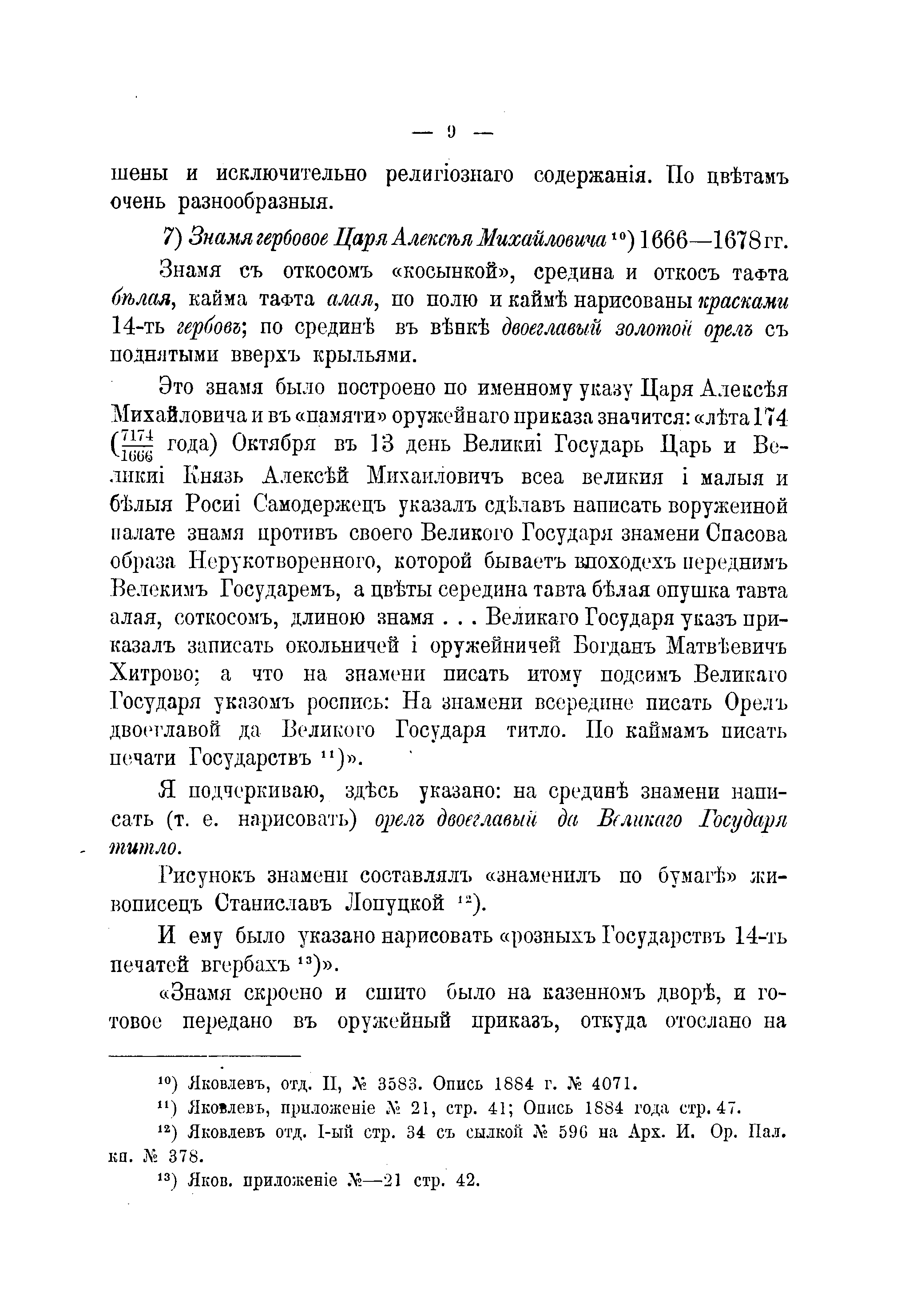 Краткий популярный очерк известного специалиста по военной и военно-морской истории России посвящен описанию знамён, начиная с хоругвей и стягов времён великого князя Дмитрия Донского (в XIV в.) до знамён, принятых в полках Российской императорской армии в эпоху Александра I. В брошюре приведено описание более 320 русских знамён различных периодов российской истории, особое внимание сосредоточено на знамёнах петровского времени. В правление последнего российского императора Николая II в придворных кругах широко обсуждалась проблема национальных цветов. Капитан-лейтенант Белавенец П.И, являясь членом Особого совещания при Министерстве юстиции для выяснения вопроса о русских государственных национальных цветах в 1910-1912 гг., весьма плодотворно занимался геральдикой, историей знамен и флагов. В ходе работы Совещания, и в печати велась острая полемика между сторонниками бело-сине-красного и черно-золото-белого флагов. Сторонниками первого был П.И. Белавенец, доставивший бело-сине-красное знамя Петра Великого, хранившееся в Архангельске и собравший сведения о русских знаменах, захваченных шведами под Нарвой, переиздавший и прокомментировавший книгу К. Алярда о флагах (Амстердам, 1695; Москва, 1709), а затем составивший специальную записку о русских знаменах. Результатом этой деятельности и стало данное издание.