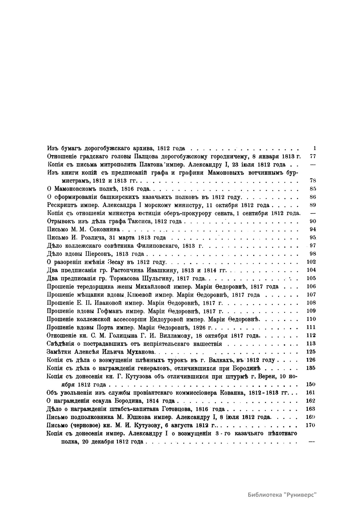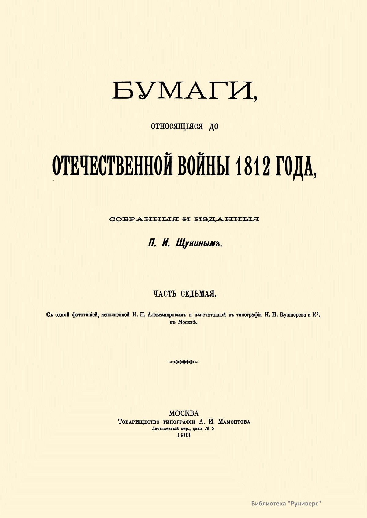Многочисленные документы, собранные и изданные П.И. Щукиным, относятся к Отечественной войне 1812 года. В издании опубликованы донесения, отчеты, указы, описи, письма разных лиц, протоколы, постановления, предписания, прошения и т.д. В этих бумагах содержатся подробности, которые невозможно встретить ни в одном учебнике истории и которые, будучи собранными вместе, и составляют подлинную картину российской истории начала XIX века.