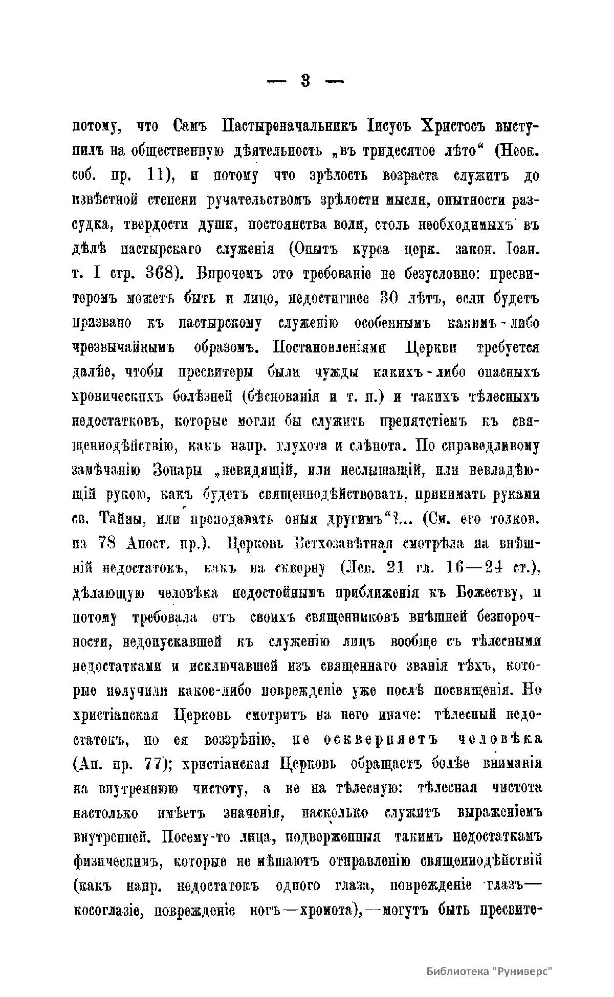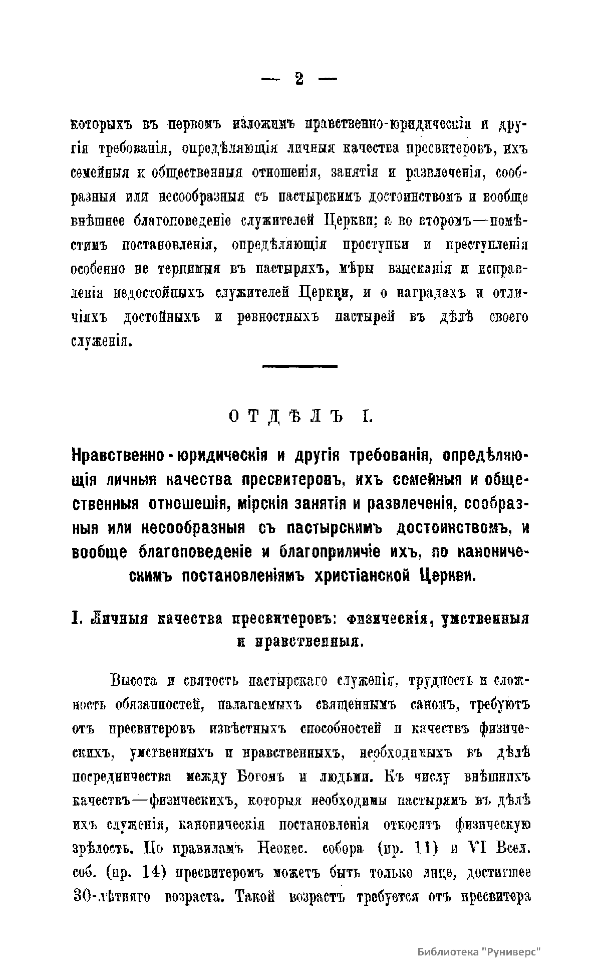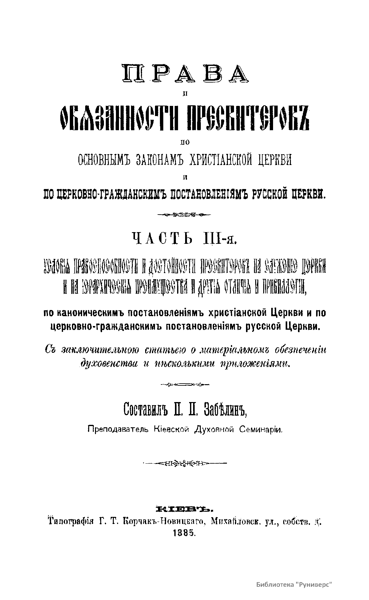 Права и обязанности пресвитеровъ по основнымъ законамъ Христiанской Церкви и церковно-гражданскимъ постановлениямъ Русской Церкви. Часть III-я. Условiя правоспособности и достойности пресвитеровъ на служенiе Церкви и на iерархическiя преимущества и другiя отличiя и привилегiи