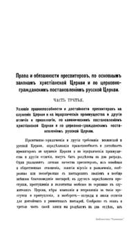 Права и обязанности пресвитеров по основным законам Христианской Церкви и церковно-гражданским постановлениям Русской Церкви. Часть III-я. Условия правоспособности и достойности пресвитеров на служение Церкви и на иерархические преимущества...