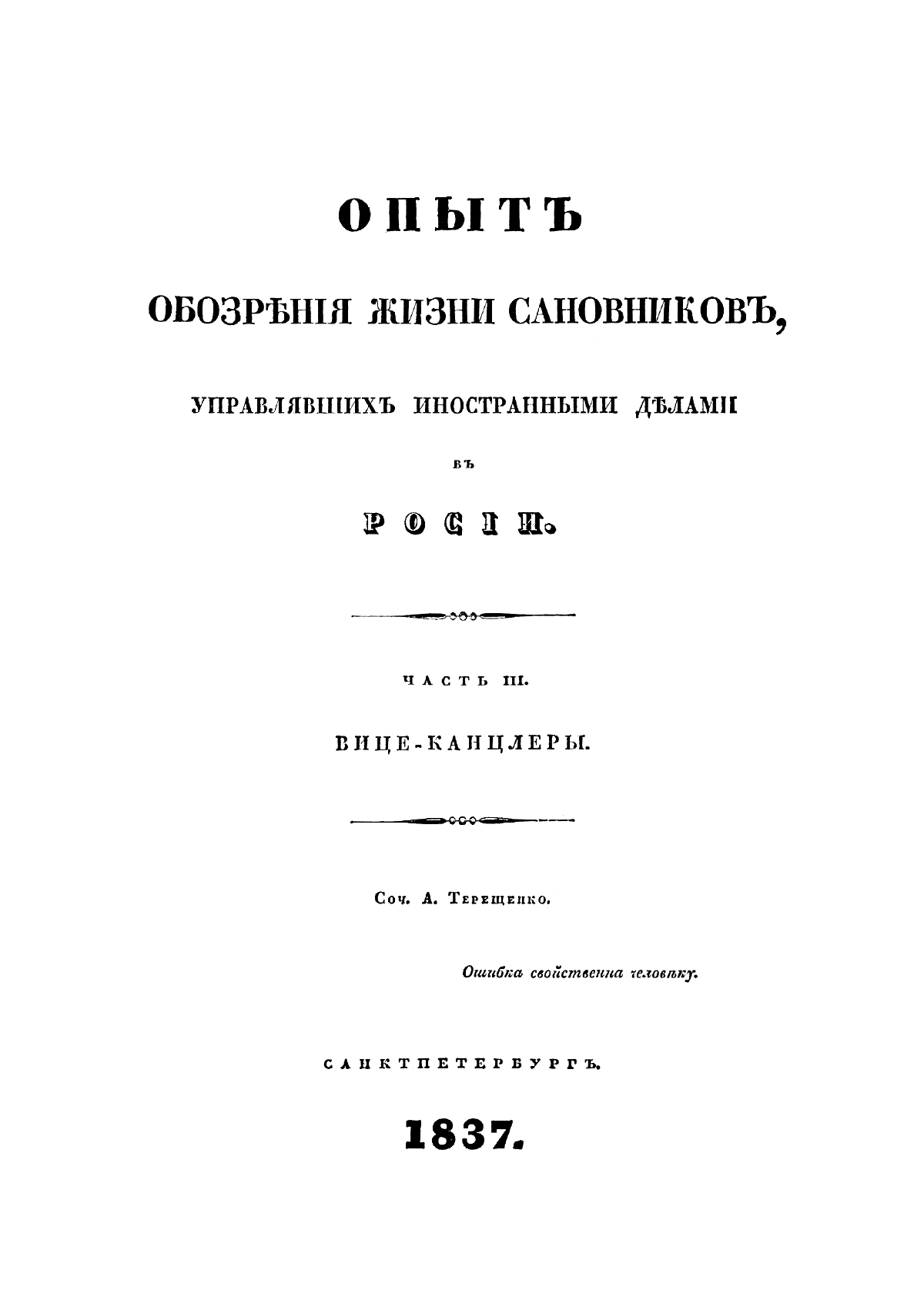 Терещенко Александр Власьевич (1806–1865) — этнограф и археолог, был сотрудником Археографической комиссии. Главные его труды: «Опыт обозрения жизни сановников, управлявших иностранными делами в России», «Быт русского народа», «Очерки Новороссийского края». «Опыт обозрения жизни сановников» состоит из трех частей. Первая часть посвящена сановникам, управлявшим иностранными делами до учреждения звания канцлеров, вторая — канцлерам, третья — вице-канцлерам. В издании полно представлены жизнеописания виднейших русских дипломатов — А. Л. Ордын-Нащокина, А. С. Матвеева, В. В. Голицына, А. П. Бестужева-Рюмина, Н. П. Румянцева, В. П. Кочубея, А. Б. Куракина и многих других. Автор уделяет внимание не только успехам именитых сановников на внешнеполитическом поприще, но и рассказывает об их происхождении, семье, характере, привычках.