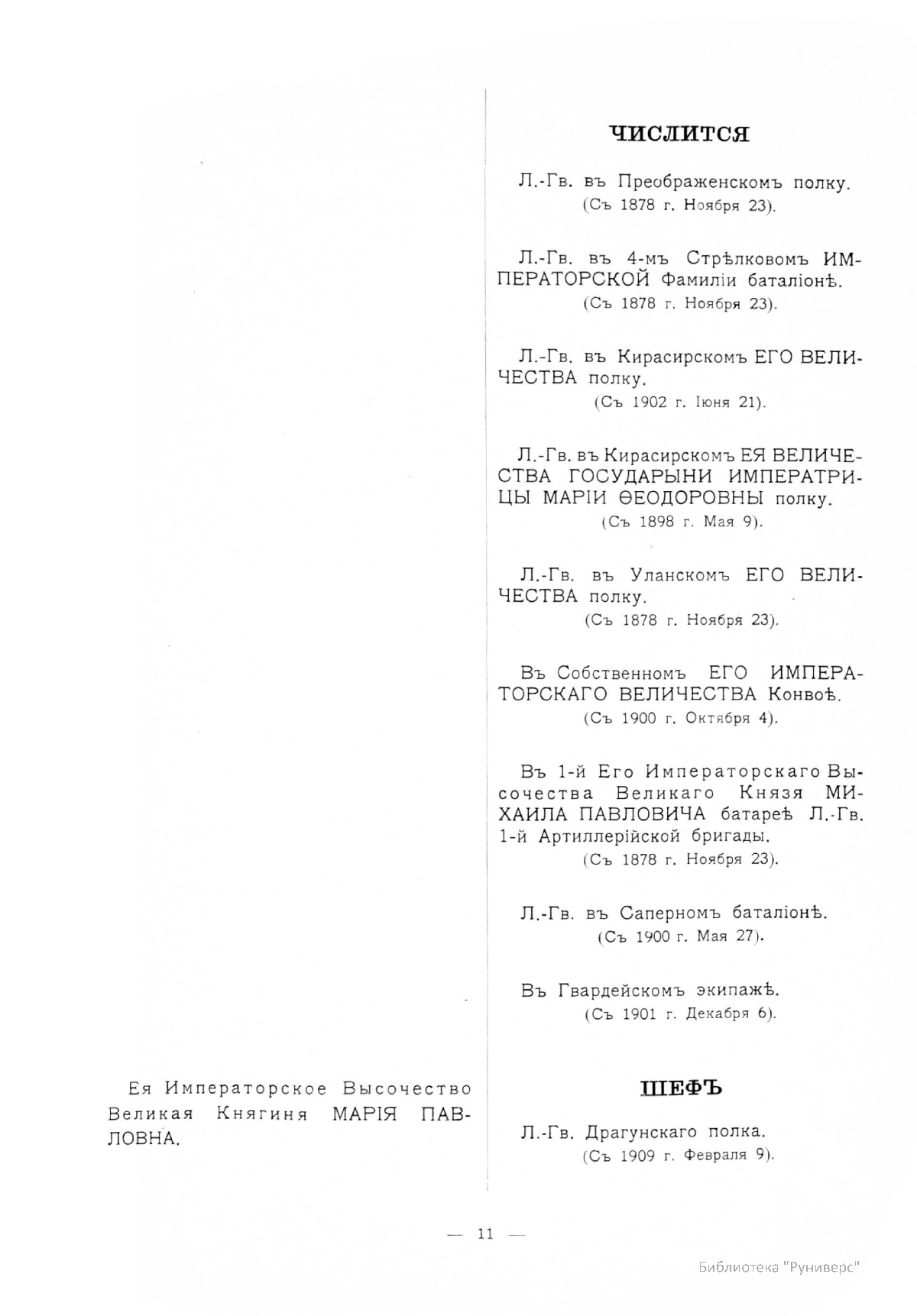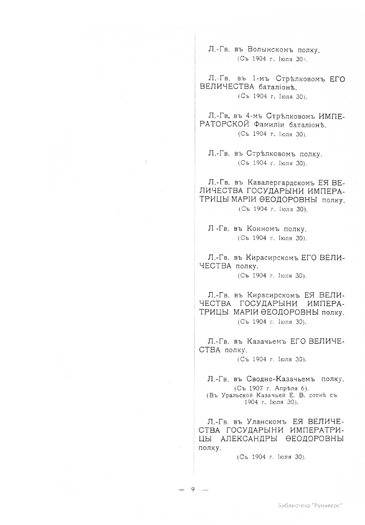 Краткие истории частей Императорской гвардии, наименования и переименования, командиры, шефы, боевой путь, награды гвардейских частей. Широко известные цветные таблицы униформы, составленные В. К. Шенком.