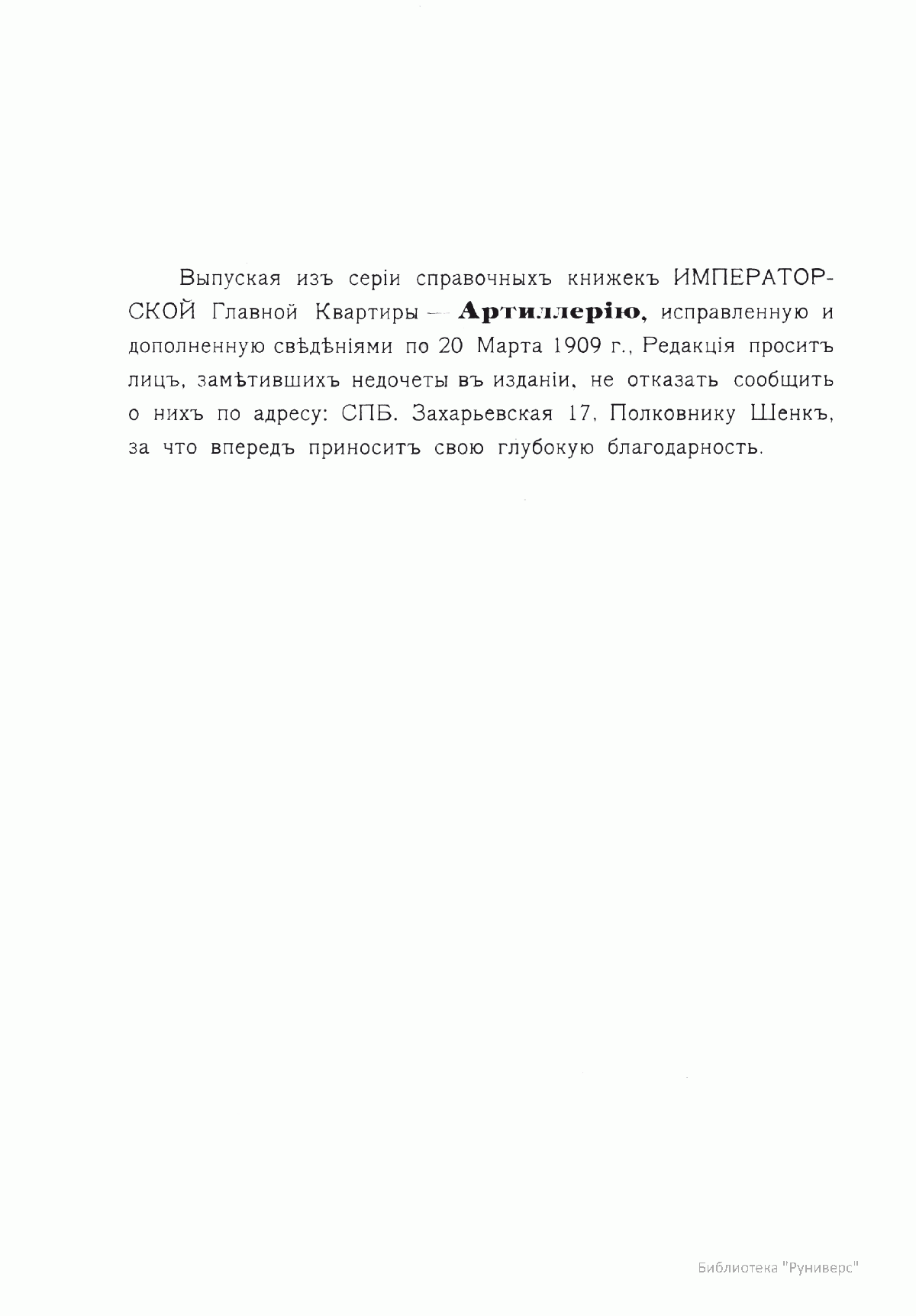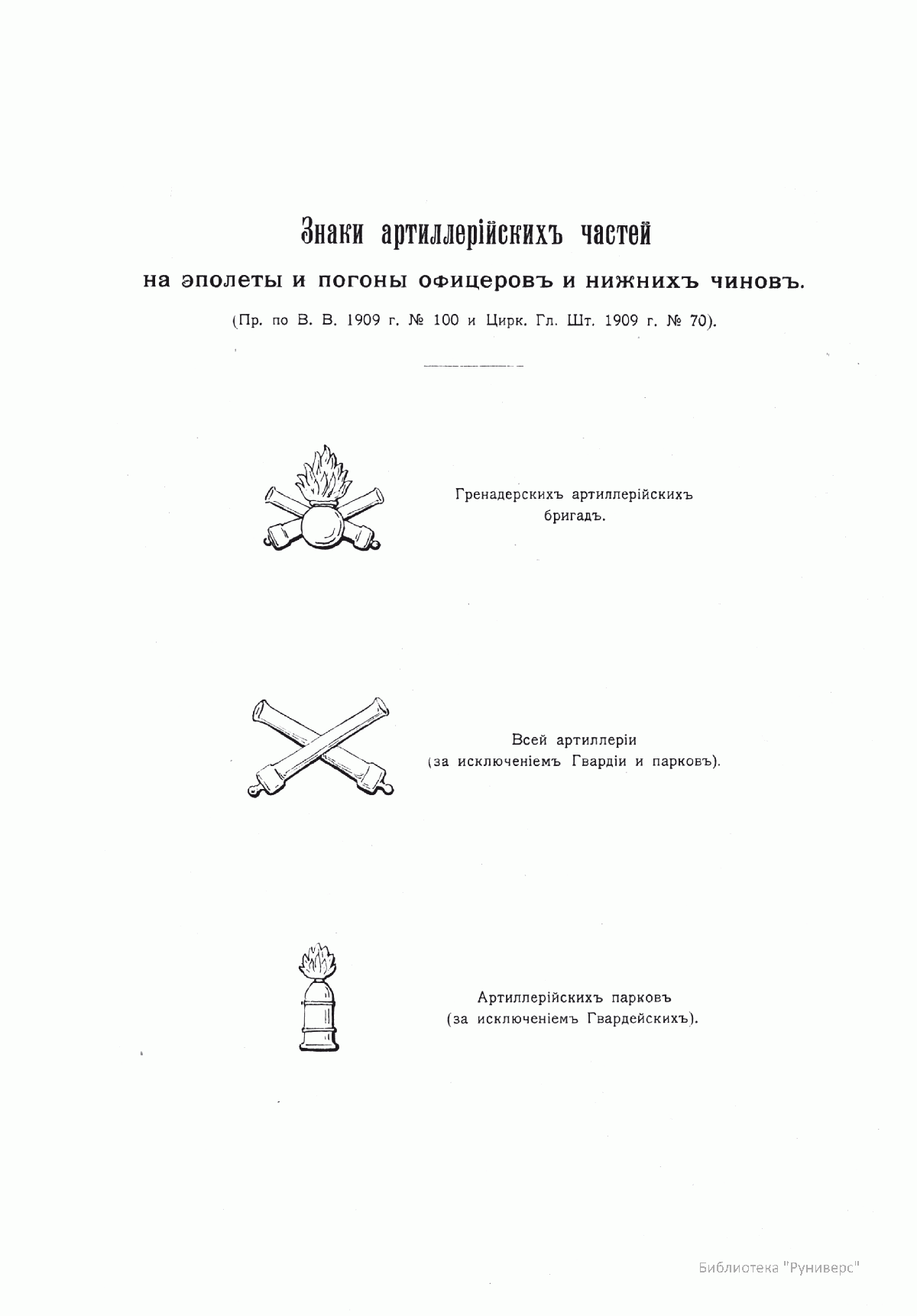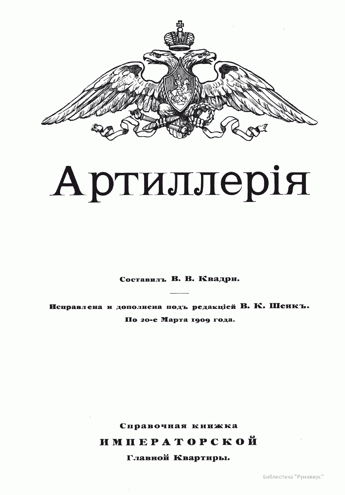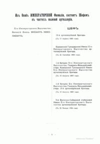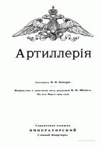 Справочная книжка Императорской главной квартиры со сведениями по 20 марта 1909 года. Представлена структура артиллерии как рода войск на начало XX века.