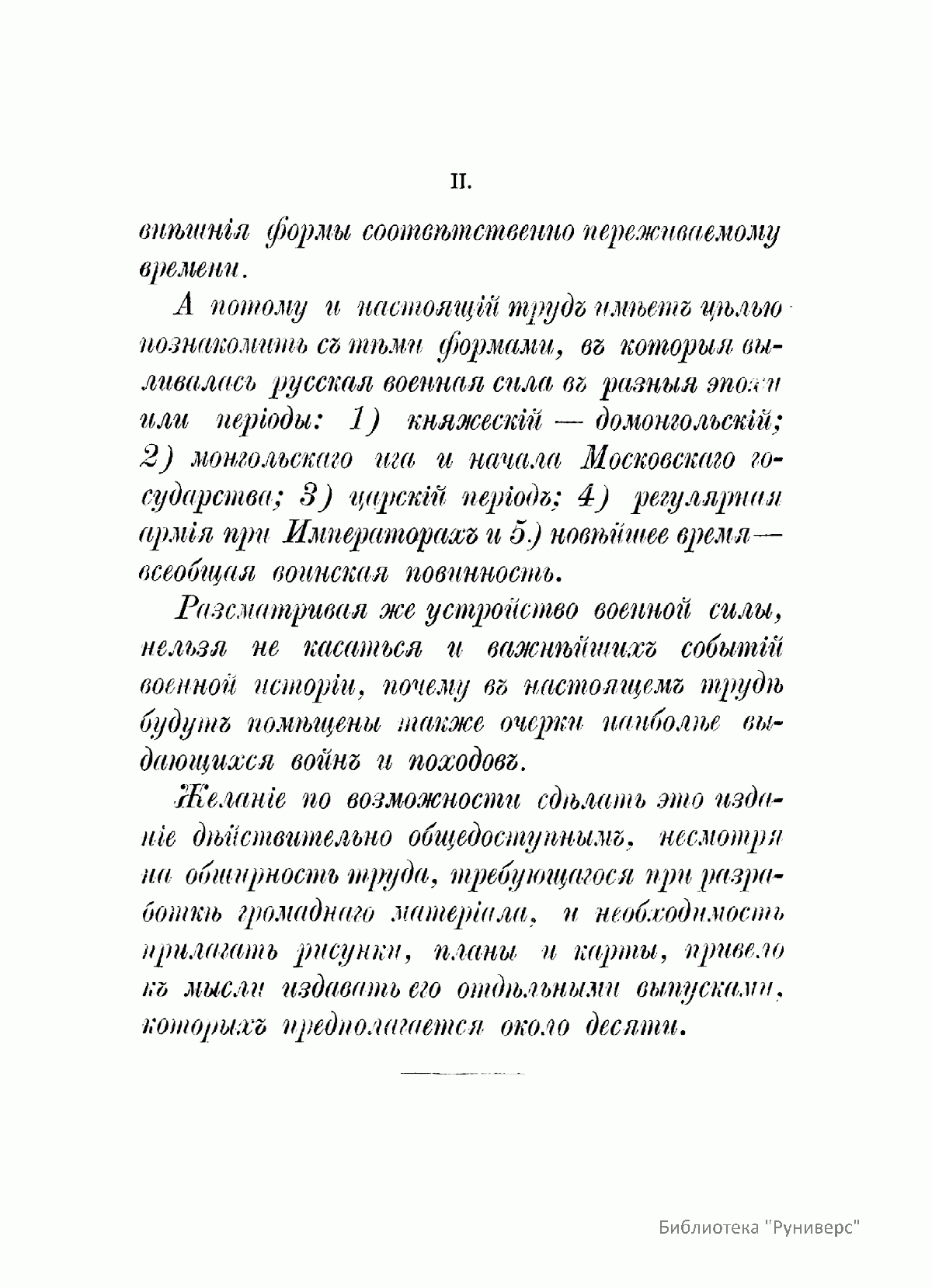 Данные очерки повествуют об истории военной силы на Руси от зарождения войска у древних славян до появления массовой армии эпохи Александра II и основных событий русско-турецкой войны 1877-1878 гг. Первые пять выпусков были посвящены периоду с древнейших времен до начала петровской эпохи в XVIII в. С 6-го по 11 выпуски сочинения описывают все важнейшие события ратной истории Российской империи XVIII и XIX веков, среди которых - Северная (1700-1721) и Семилетняя (1756-1763) войны, русско-турецкие войны 1769-1774 и 1787-1791 гг., участие России во 2-й антифранцузской коалиции 1799-1802 гг., Отечественная война 1812 года, Восточная (Крымская) война (1853-1856), наконец последняя русско-турецкая война (1877-1878 гг.). По своему характеру это издание представляет общедоступные очерки, написанные профессиональными военными историками на основе ранее изданных общеисторических и военно-исторических работ. В сжатой форме в них даны, в основном довольно ясно и правильно, общие сведения по развитию вооруженных сил Российского государства, а отдельные главы посвящены важнейшим этапам вооруженной борьбы России. Занимательный текст издания способствовал быстрому её распространению. Уже в 1892 г. было предпринято второе издание этих популярных очерков в 2-х томах. Более того, данное издание хорошо иллюстрировано. Оно содержит рисунки одежды и вооружения воинов разных эпох, карты, схемы сражений и укреплений важнейших битв и сражений в отечественной военной истории. В истории строительства вооруженных сил России было много необычного, оригинального в их комплектовании, организации, развитии способов военных действий, быте, взаимоотношениях военнослужащих и т.п., что особенно интересно будет узнать из этой книги широкому кругу читателей.