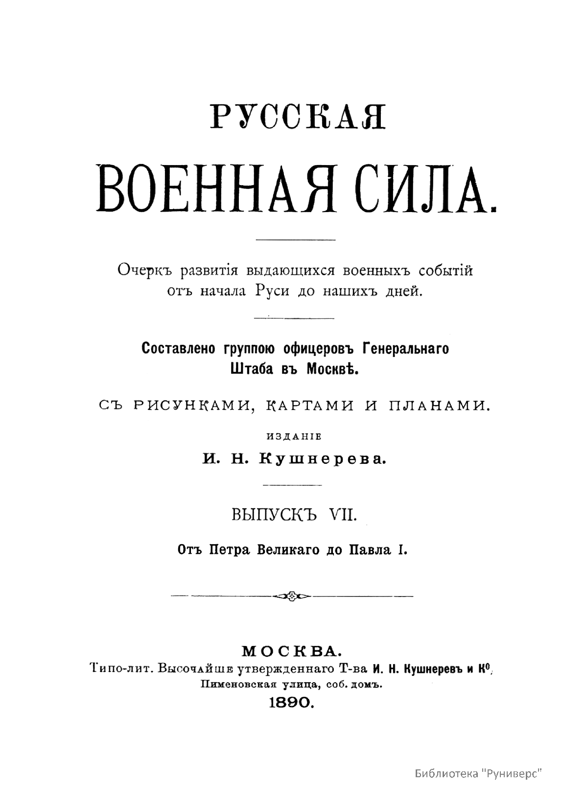 «Русская военная сила» (Очерк развития выдающихся военных событий от начала Руси до наших дней), составленная обществом офицеров Генерального штаба в Москве, начала публиковаться с 1888 г. «Русская военная сила» по праву считалась одним из лучших сводных общедоступных исследований по российской военной истории.