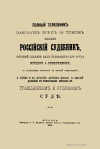 Полный толковникъ законовъ всѣх 16 томовъ или Россiйскiй судебникъ, который служитъ какъ руководство для всѣхъ истцовъ и отвѣтчиковъ, съ указанiемъ способовъ къ личной самозащитѣ, а также и къ начатiю всякихъ исковъ и преслѣдованiю по тяжебнымъ дѣламъ въ гражданскомъ и уголовномъ судѣ