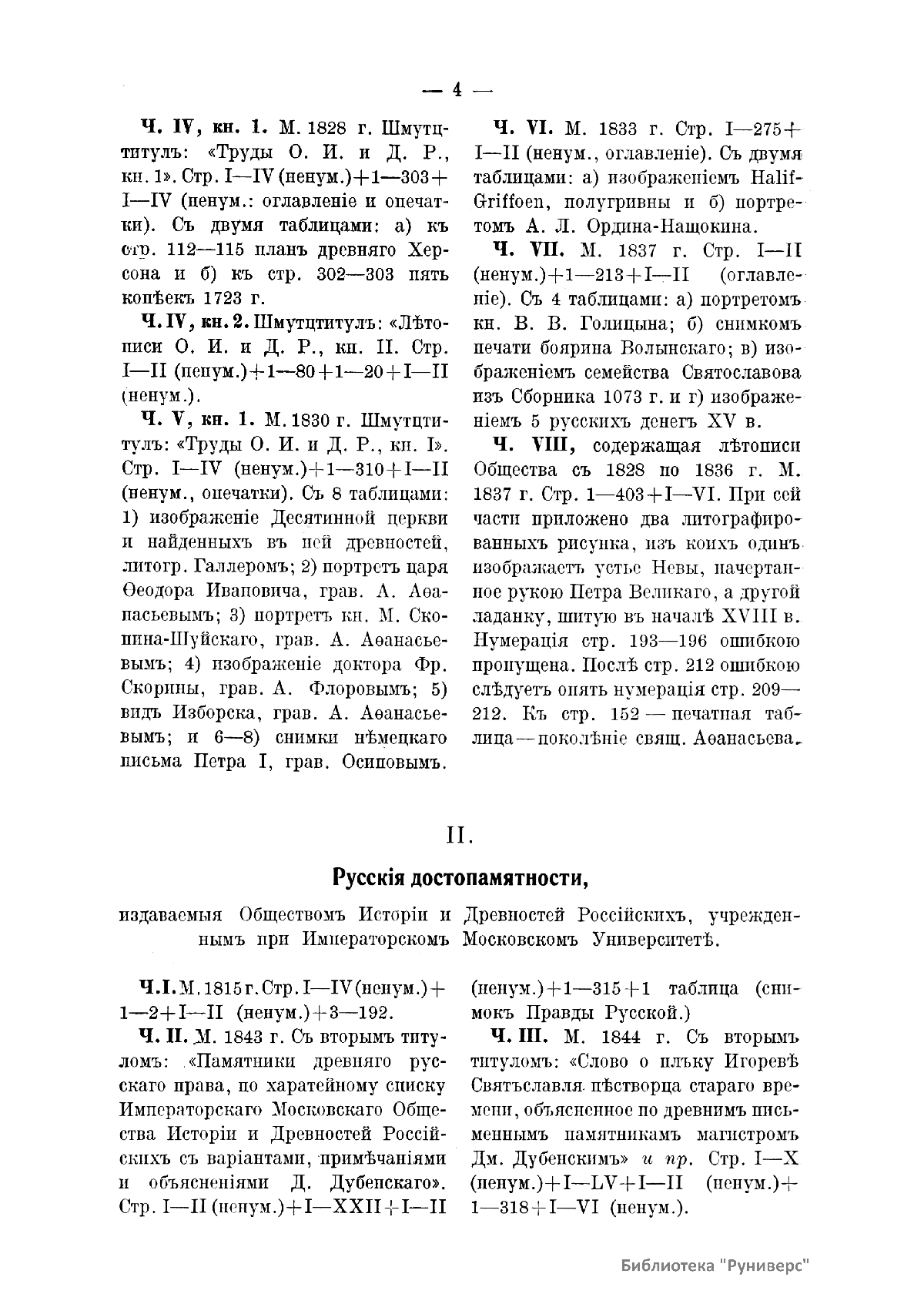 Общество истории и древностей российских при Московском университете, основанное в 1804 г., — первое научное историческое общество в Российской империи, занимавшееся изучением и публикацией документов по русской истории. Издавались сборники под заглавием «Русские достопамятности», где впервые появился ряд древнерусских памятников письменности; «Записки и труды», посвященные изучению древней географии и истории России, нумизматике; «Русский исторический сборник»; «Временник Императорского общества истории и древностей российских» и другие издания.