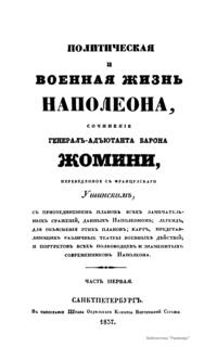 Русский перевод сочинения «Политическая и военная жизнь Наполеона» был сделан со знаменитой работы Жомини, изданной в Париже в 1827 г., — «Vie politique et militaire de Napoléon, racontée par lui-même au tribunal de César, d’Alexandre et de Frédéric» («Политическая и военная жизнь Наполеона, рассказанная им перед судом Цезаря, Александра и Фридриха»). Для данного труда Жомини избрал форму рассказа, который Наполеон ведет о своих походах. В основу этого повествования от первого лица лег, без сомнения, труд Э. О. де Лас Каза — секретаря Наполеона, записывавшего его мысли и воспоминания на острове Св. Елены, изданный в 1822–1823 гг. под названием «Mémorial de Sainte-Hélène» («Мемориал Святой Елены).