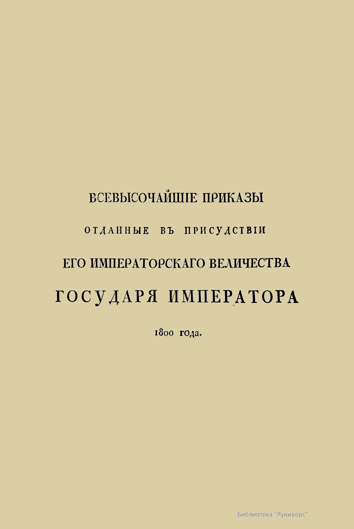 Всевысочайшие приказы, отданные в присутствии Его Императорского Величества Государя Императора, со вступления его на Всероссийкий престол. 1800